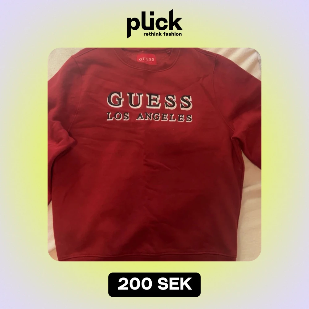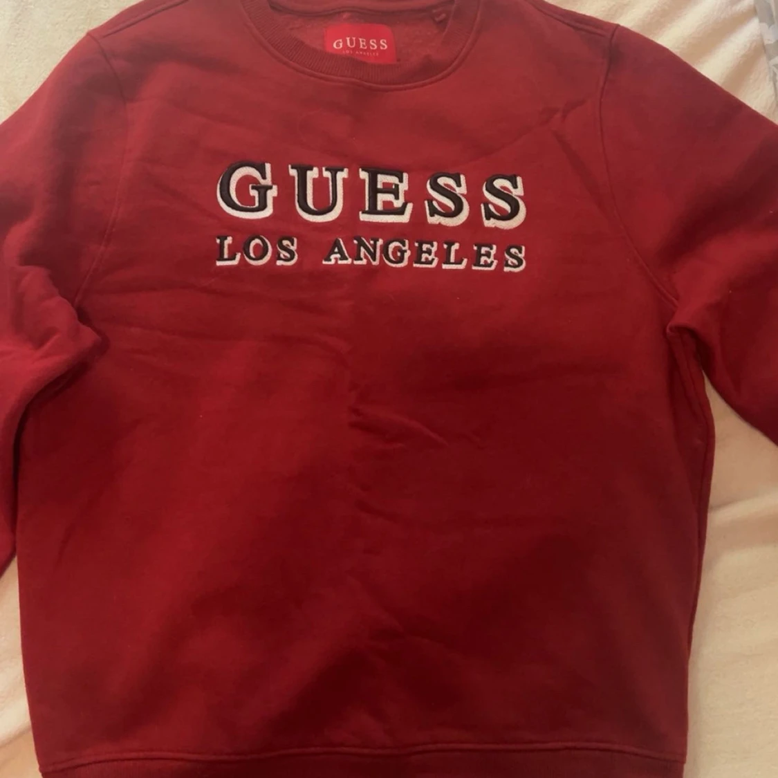Säljer en snygg röd sweatshirt från Guess med texten 'Guess Los Angeles' på framsidan. Tröjan är i storlek M och har en klassisk rund halsringning. Perfekt för en avslappnad stil och passar bra till både jeans och joggers.