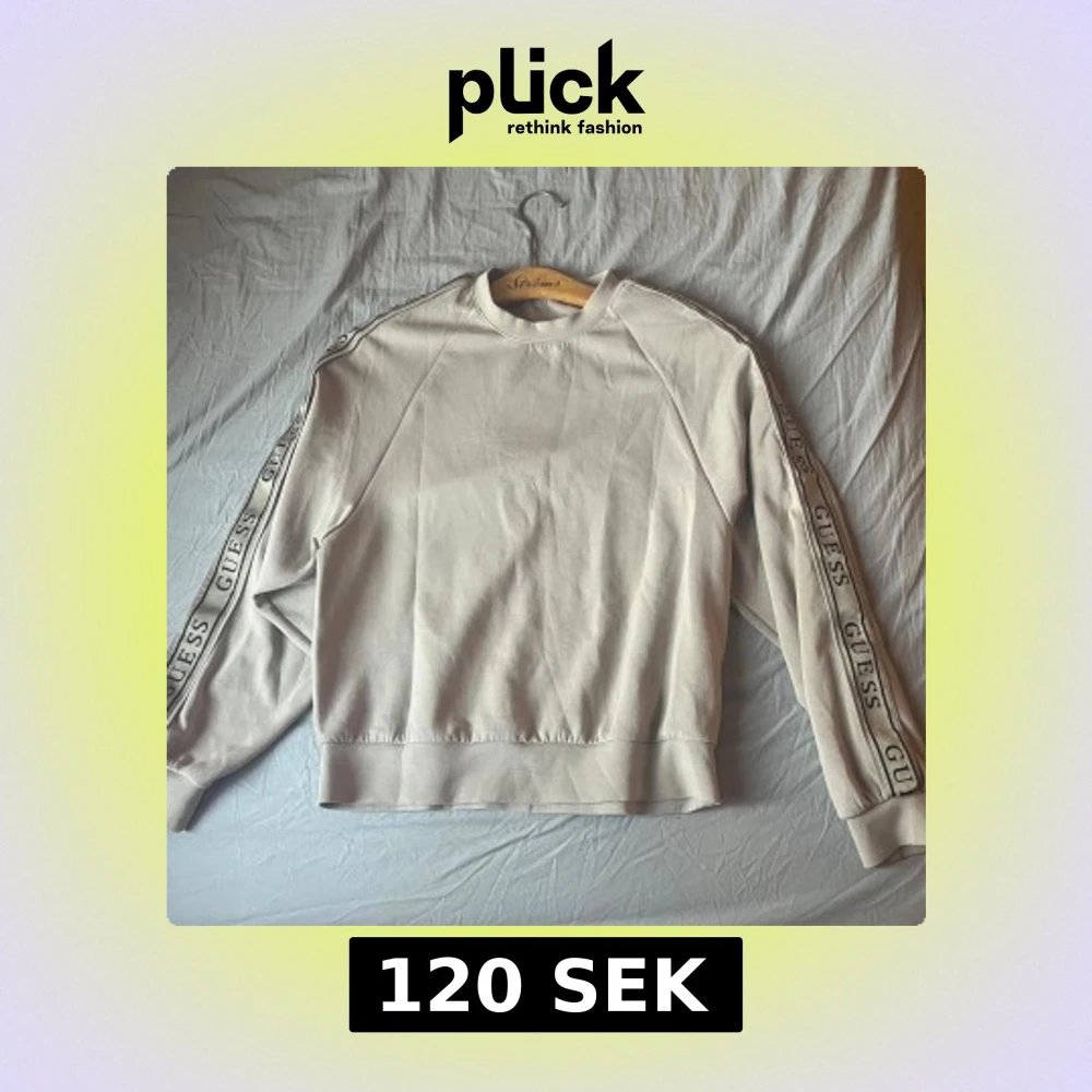 Snygg beige tunn sweatshirt från Guess med logotypband längs båda ärmarna. Tröjan har rund hals och långa ärmar med ribbade muddar.