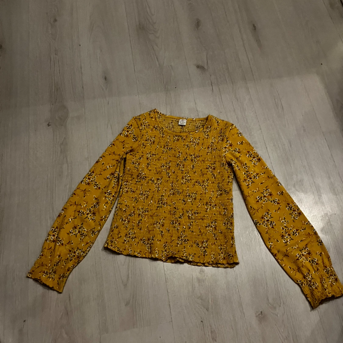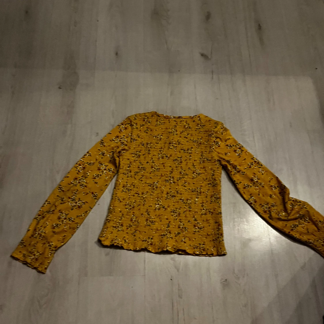 Hej ☺️jag säljer en söt gul topp från Lindex med blommigt mönster🥰. Toppen har långa ärmar och en smockad struktur som ger en fin passform. Perfekt för en färgglad look!♥️Det finns hund i hemmet 🐶