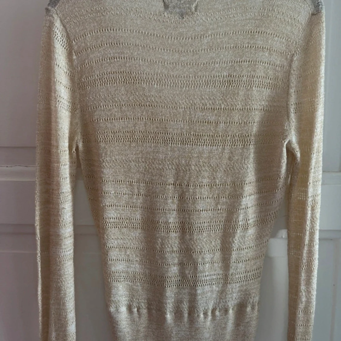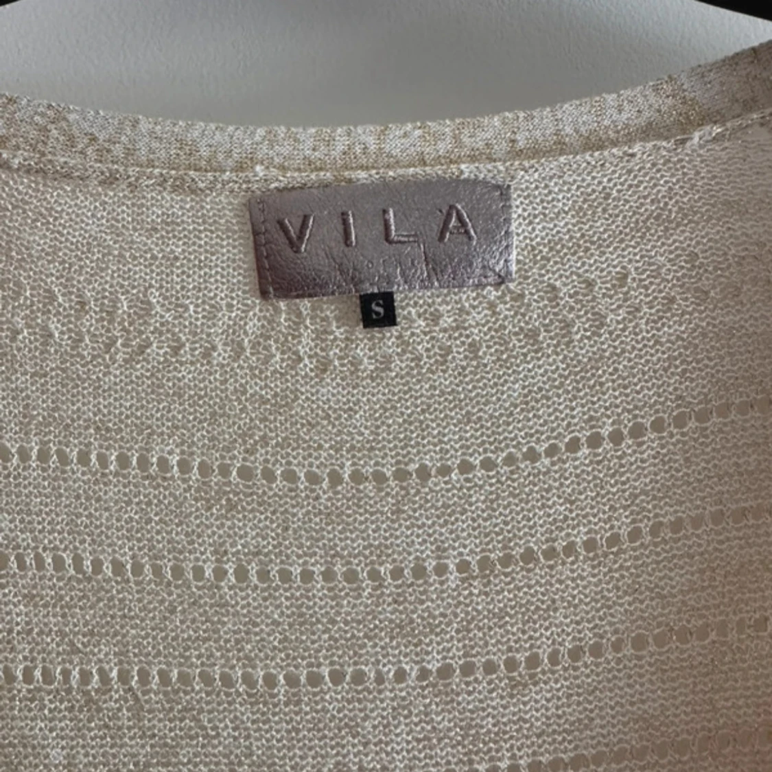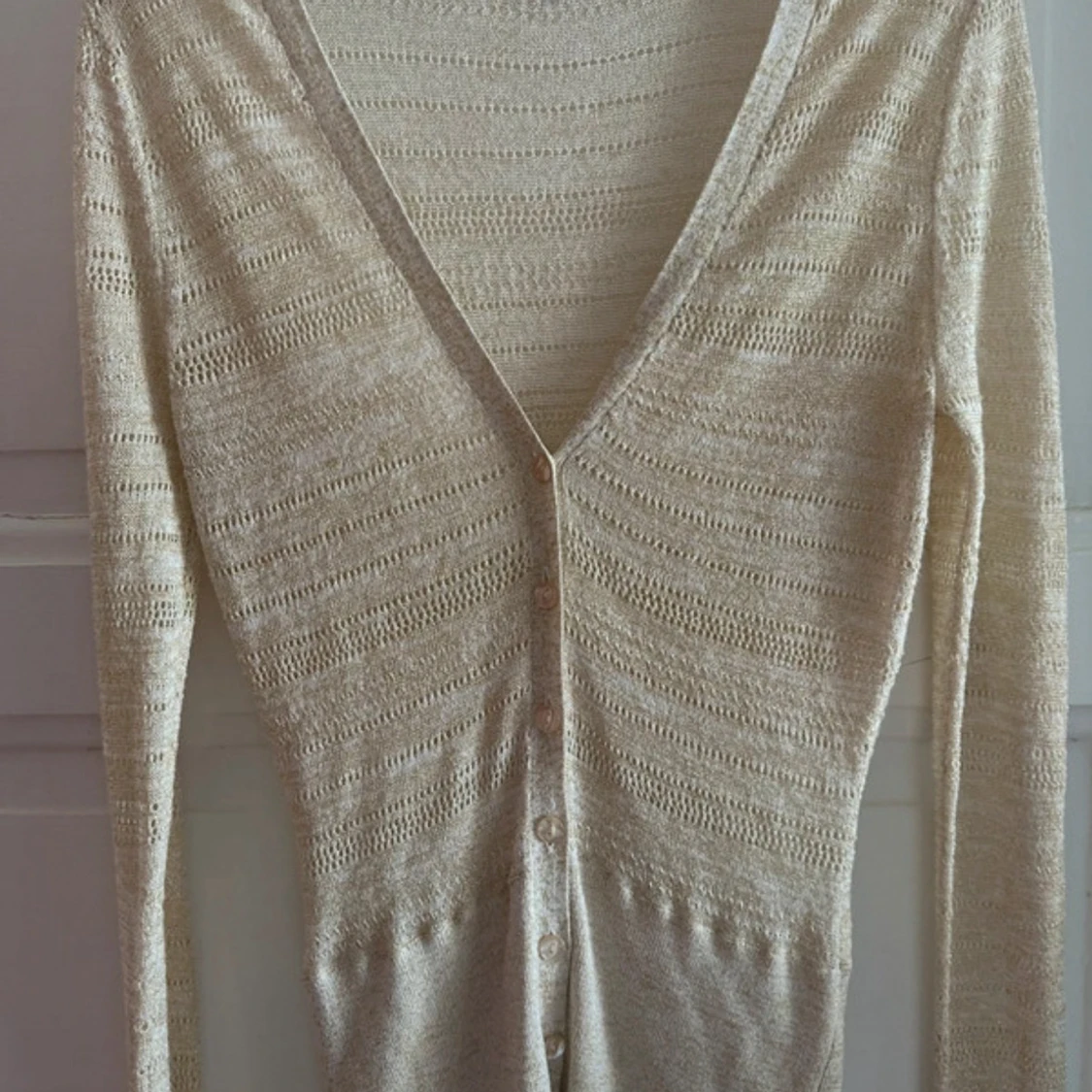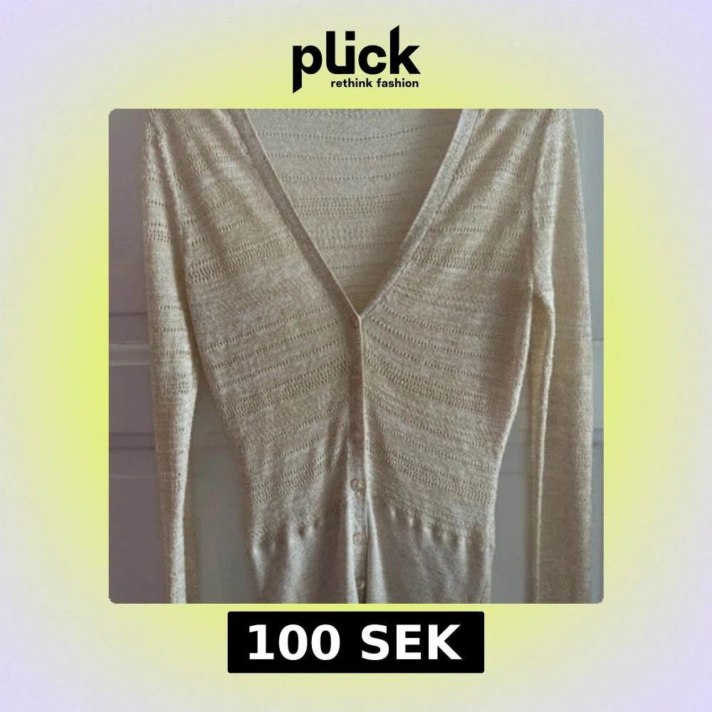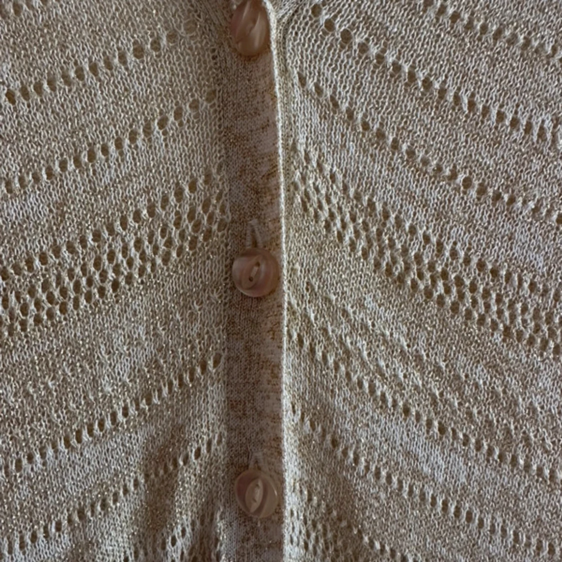 Säljer en tunn, beige stickad kofta från VILA i storlek S. Koftan har v-ringning, dekorativa knappar framtill och ett diskret hålmönster i hela plagget. Perfekt för lager-på-lager och passar snyggt till både jeans och kjol.