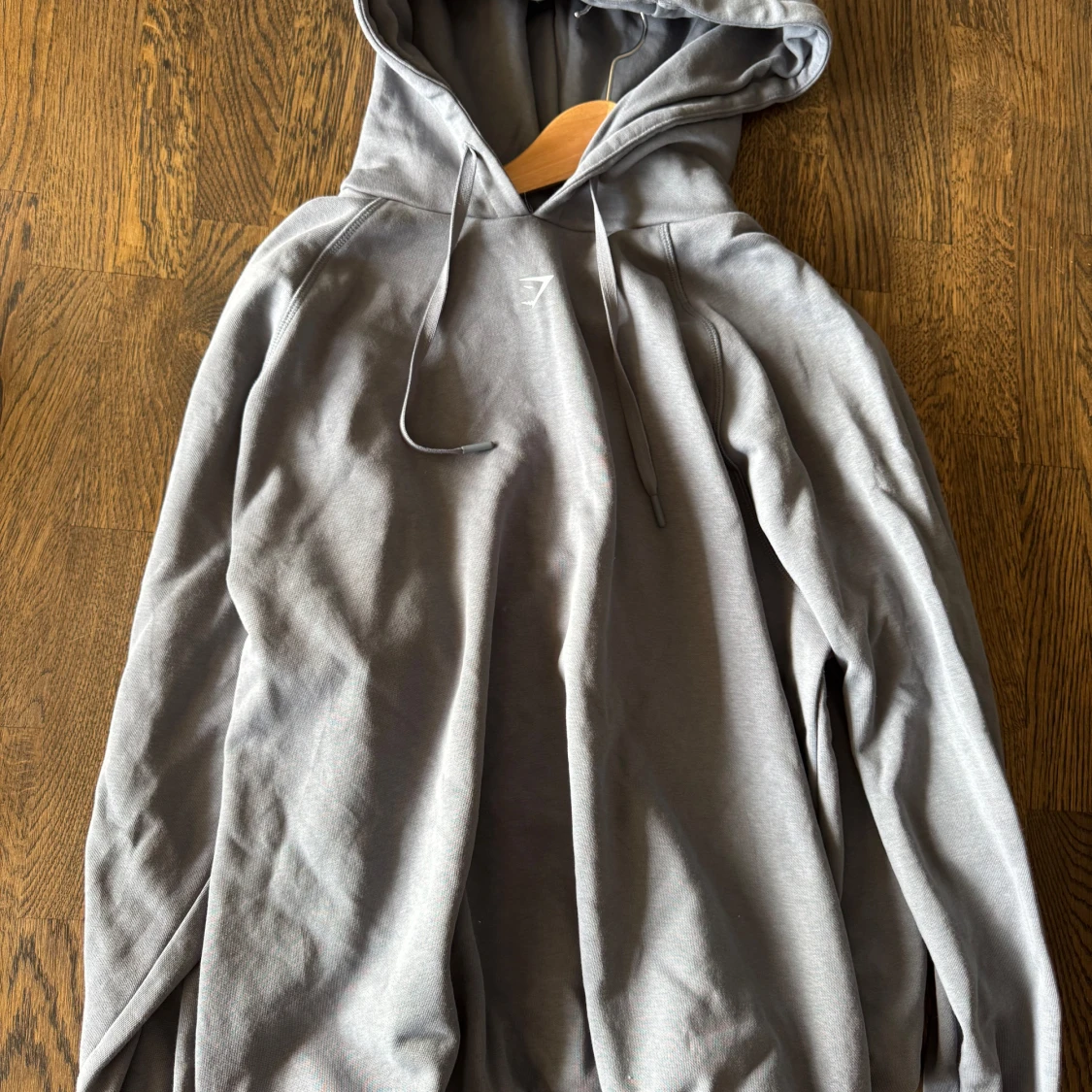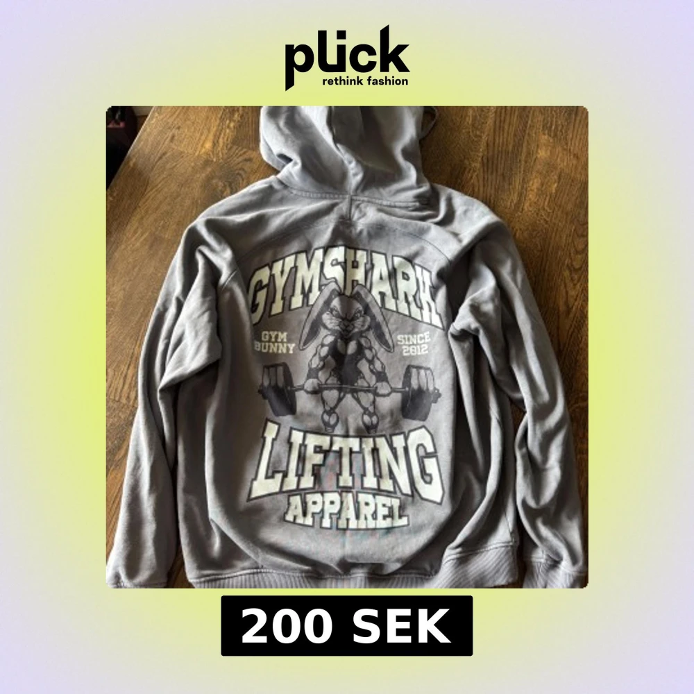 Säljer en grå/blå hoodie från Gymshark med gym bunny print på ryggen, nästan aldrig använd då den va för stor för mig, jätteskönt material verkligen!