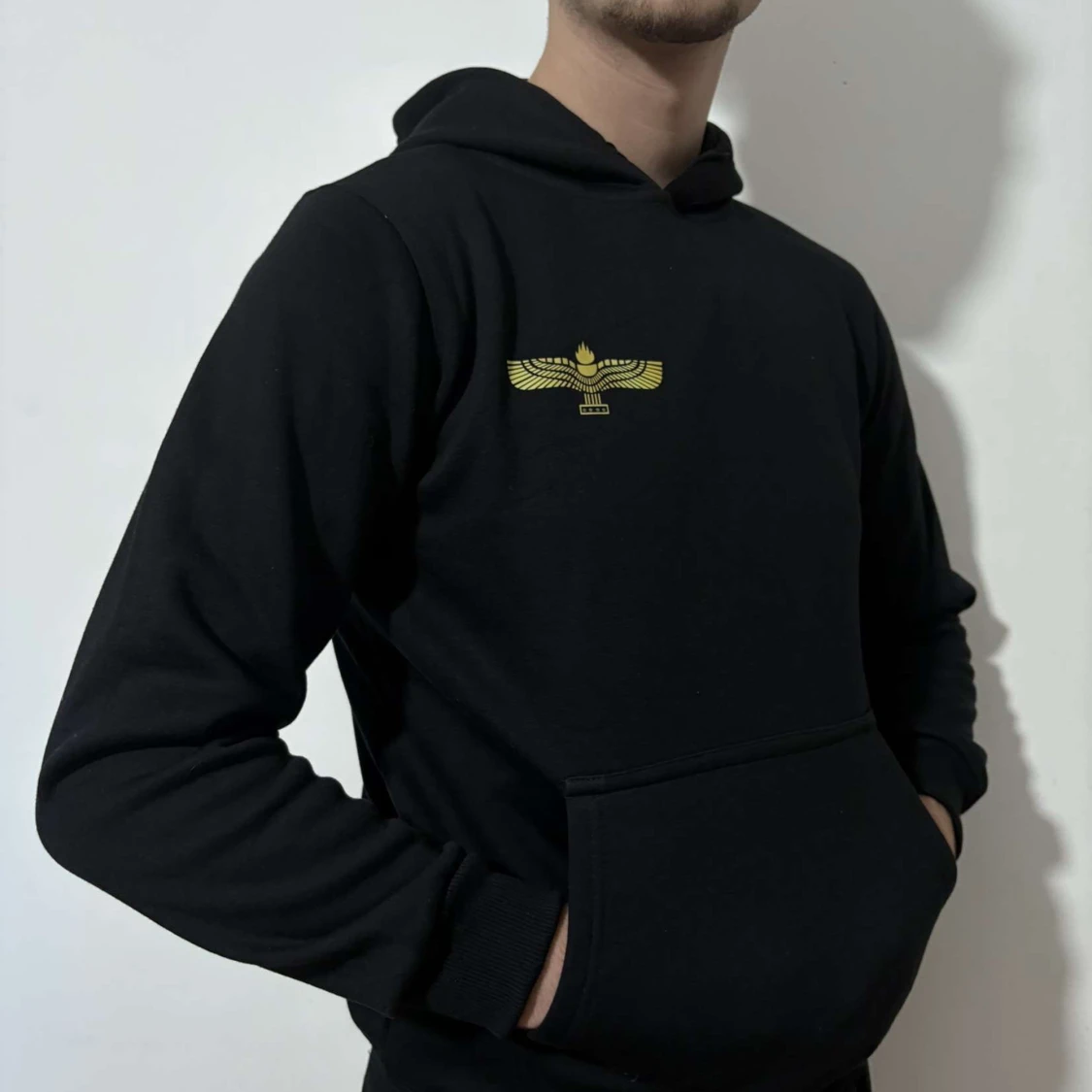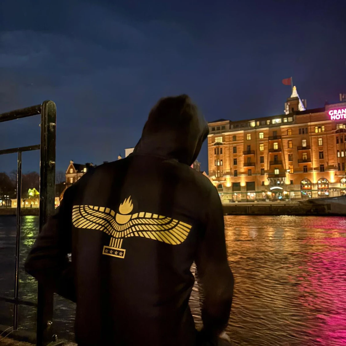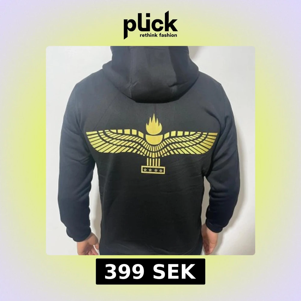 Snygg svart hoodie med ett iögonfallande guldtryck på både fram- och baksidan. Perfekt för en cool och avslappnad stil. Hoodien har en klassisk passform med långa ärmar och en praktisk magficka.