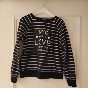 Säljer en svart och vit randig tröja till flickor med texten 'NYC Fall in Love in the city of dreams' på framsidan. Tröjan har långa ärmar och en bekväm passform. Perfekt för en avslappnad stil.