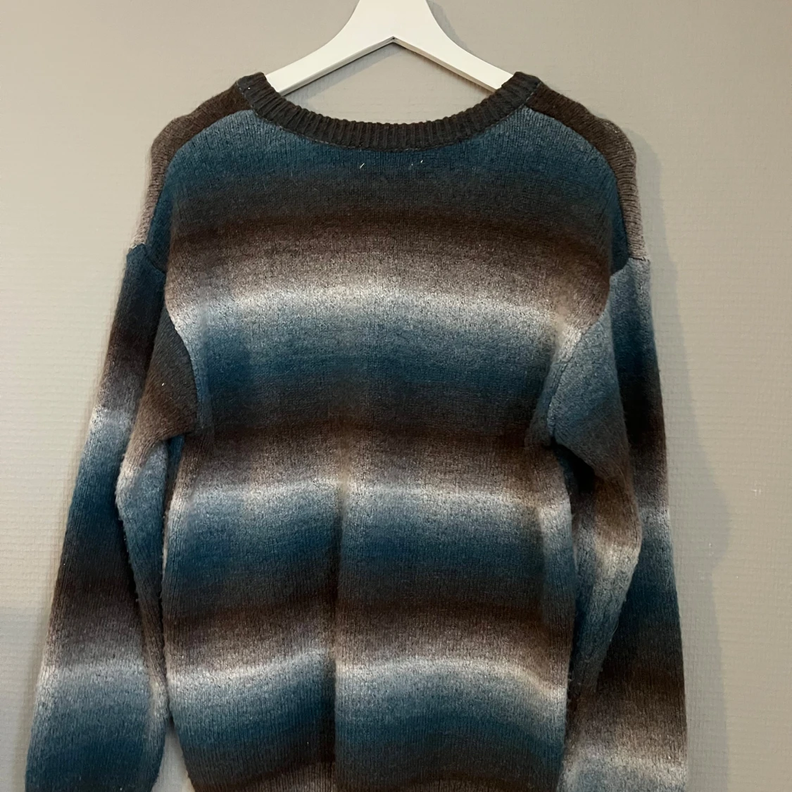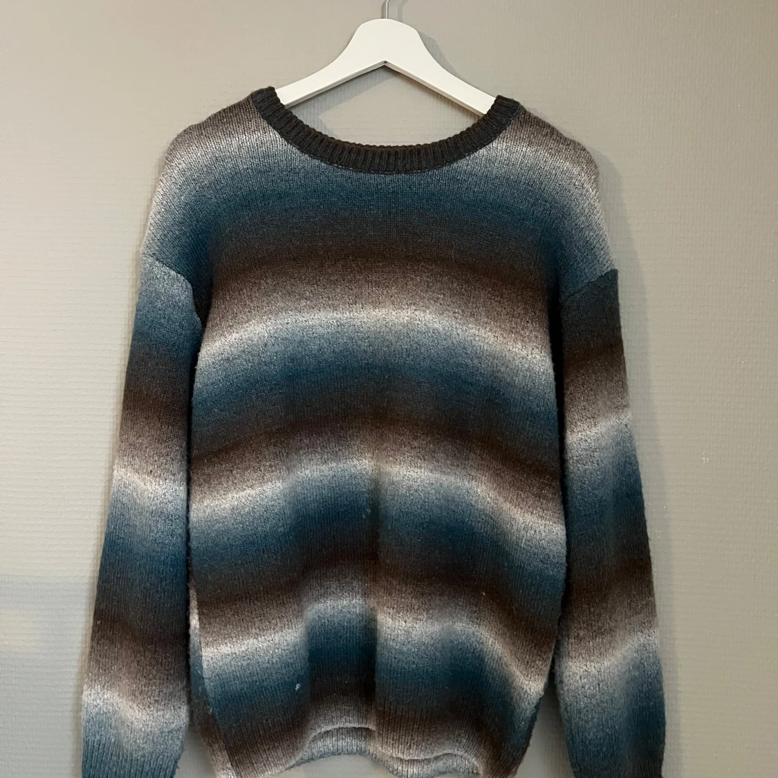 Säljer en snygg randig tröja från H&M i blå, brun och vit. Tröjan har långa ärmar och är perfekt för kyligare dagar. Den är mjuk och bekväm, vilket gör den till ett bra val för både skola och fritid.💙