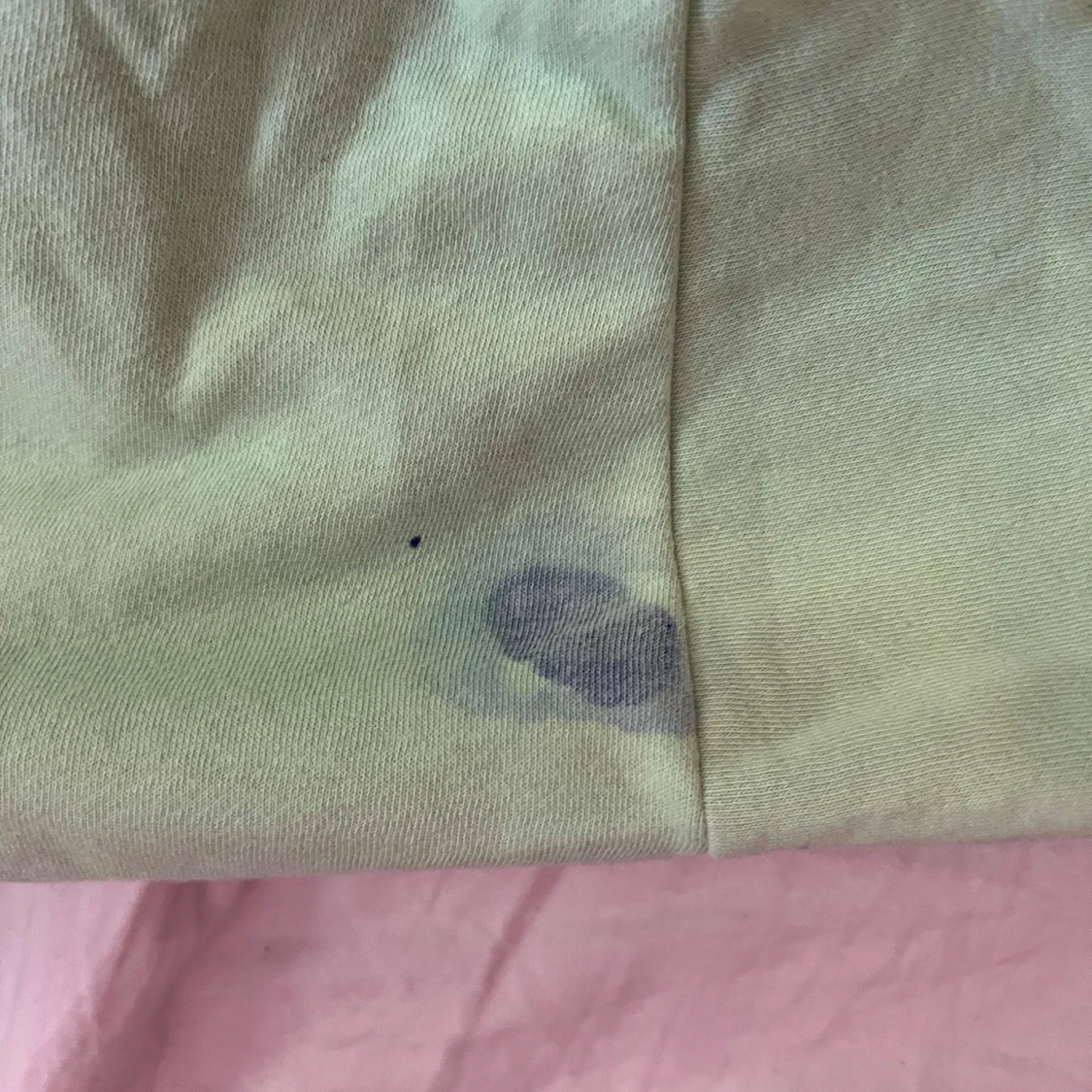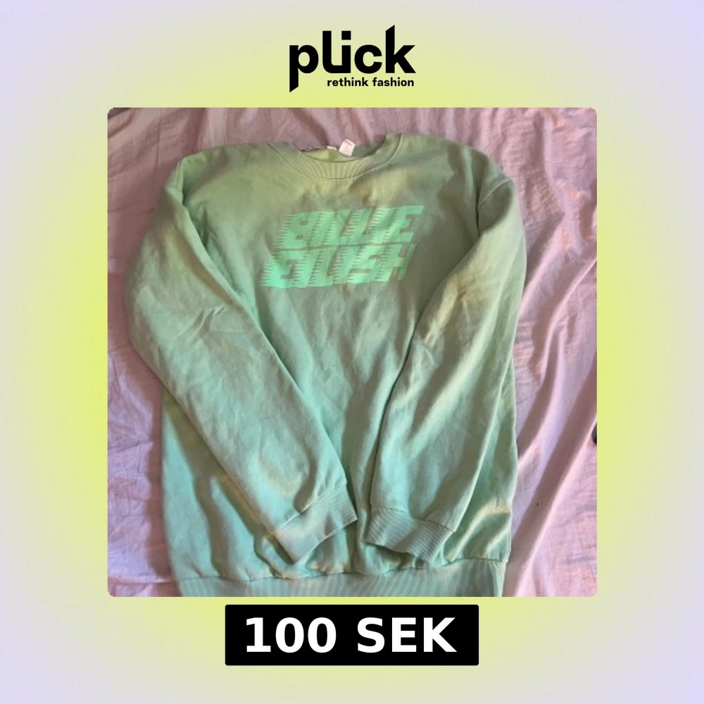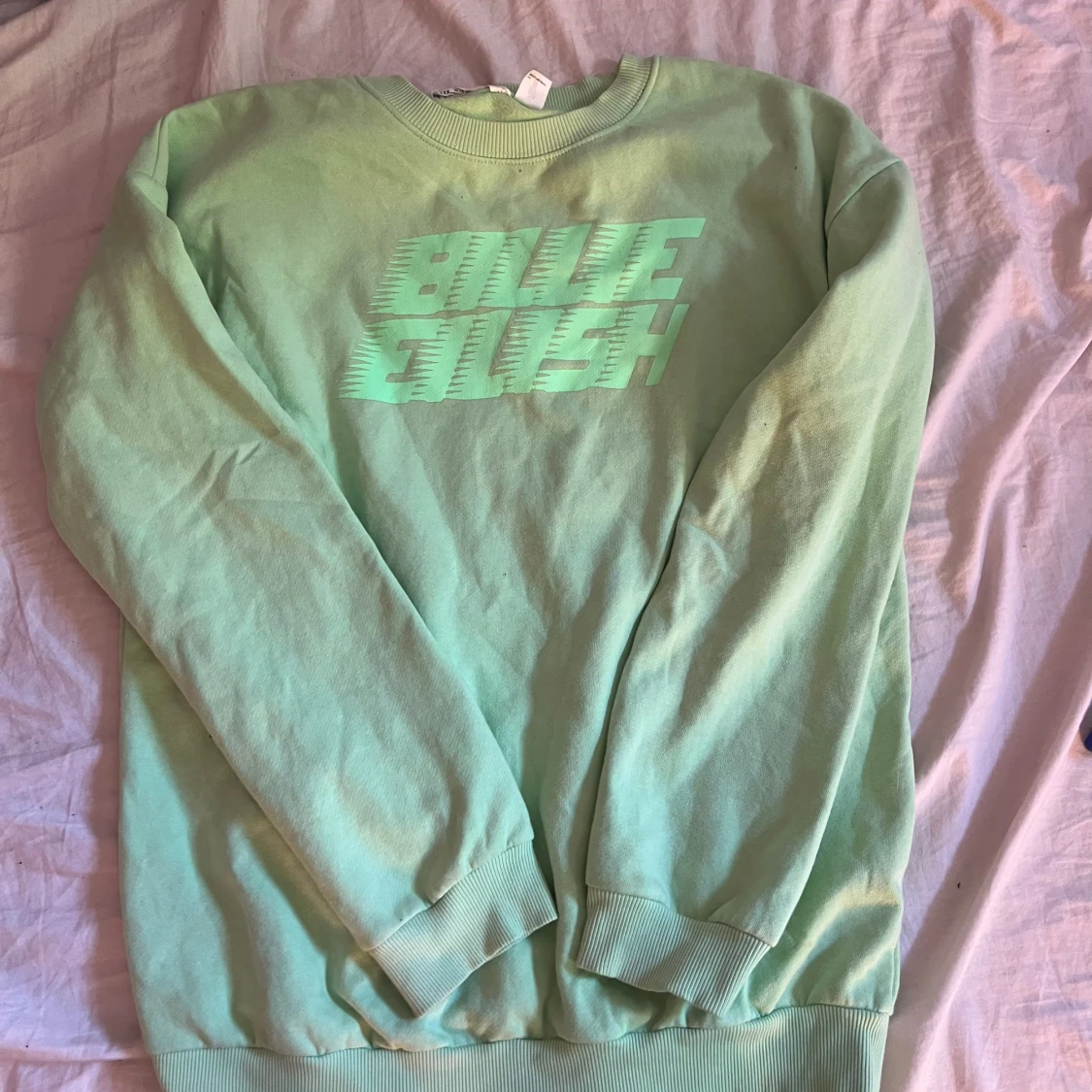 Säljer en mintgrön sweatshirt från Billie Eilish med coolt tryck framtill. Tröjan har rund hals, långa ärmar. Den har en fläck på vänster axel som inte går bort. Jätte fin!!