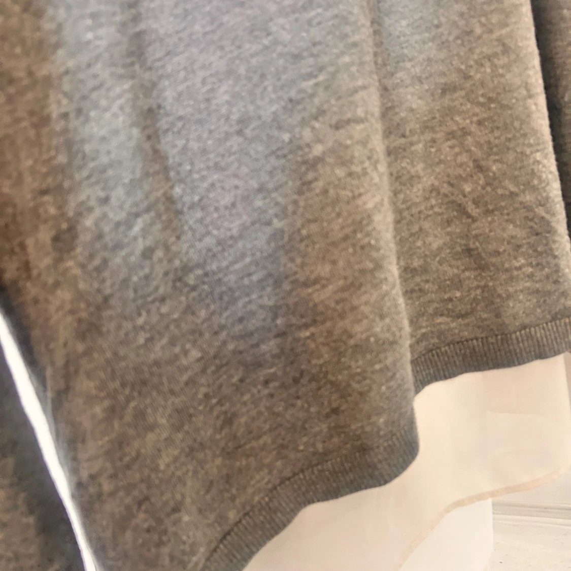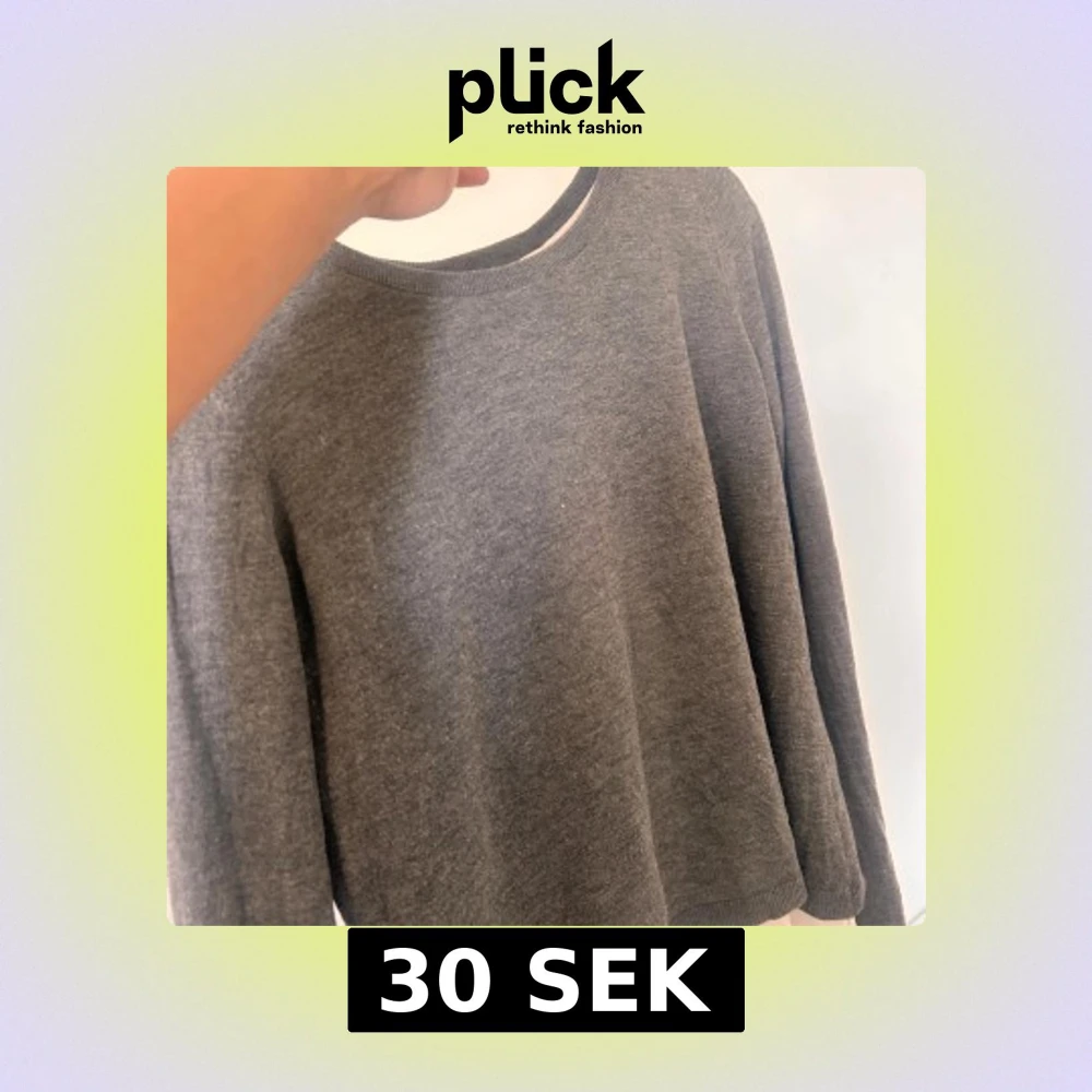 Mysig grå stickad tröja med lång ärm och en snygg öppen ryggdetalj. Tröjan har en rund halsringning och ribbade muddar vid ärmslut.