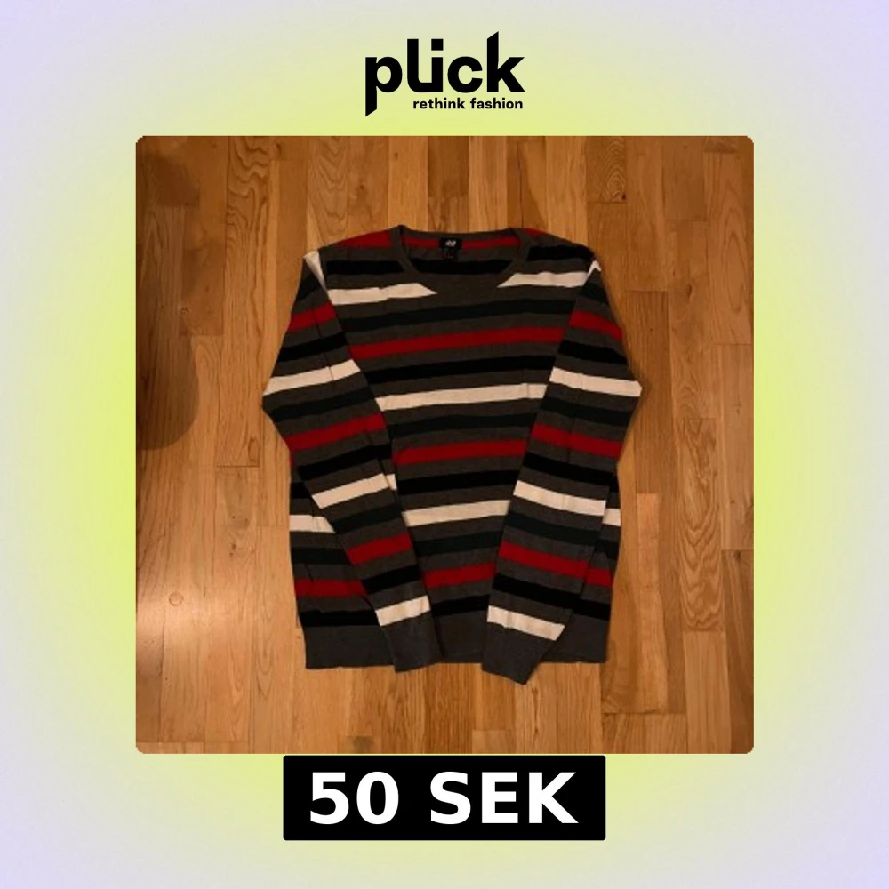 Säljer en randig tröja från H&M i färgerna svart, grå, röd och vit. Tröjan har långa ärmar och en klassisk rund halsringning. Perfekt för en avslappnad stil.
