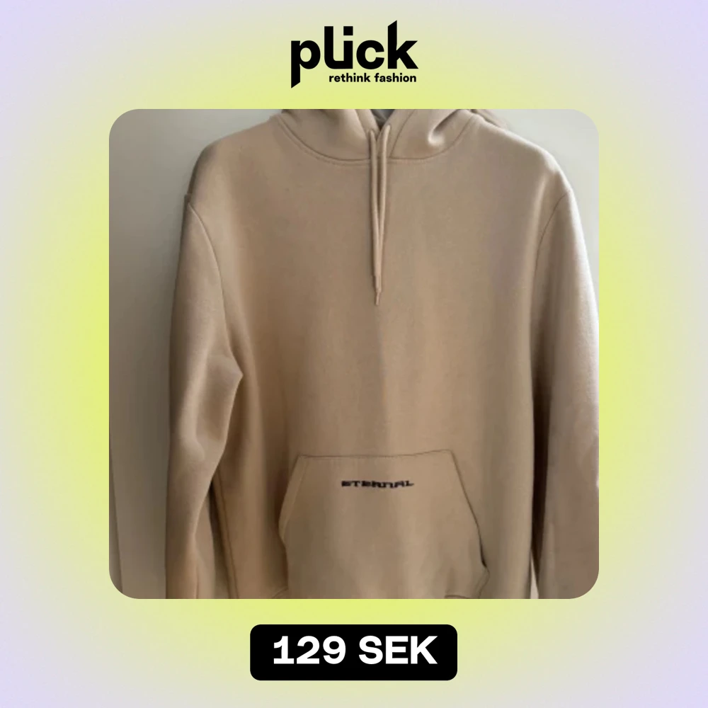 Säljer en snygg beige hoodie med texten 'Eternal' tryckt på både framsidan och baksidan. Den har en cool design med en konstnärlig illustration på ryggen. Hoodien är från HM