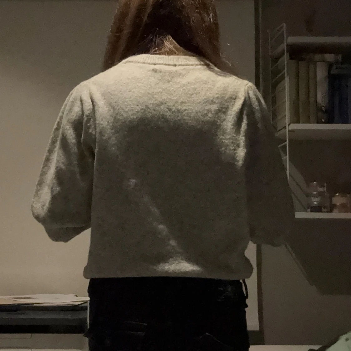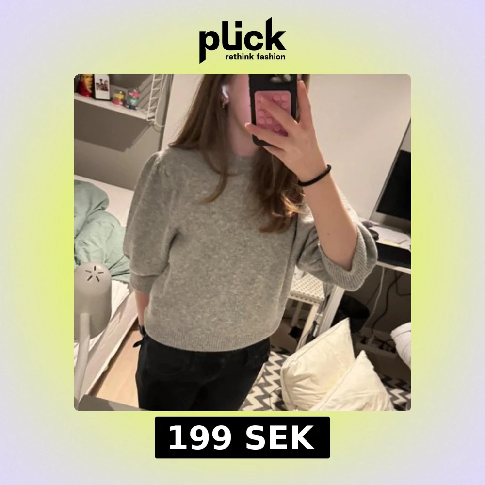 Säljer en mysig grå stickad tröja med trekvartsärm. Perfekt för kyliga dagar och enkel att matcha med olika outfits.