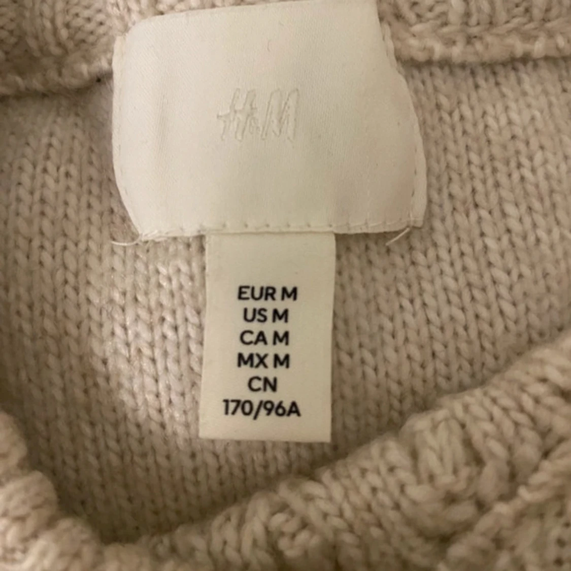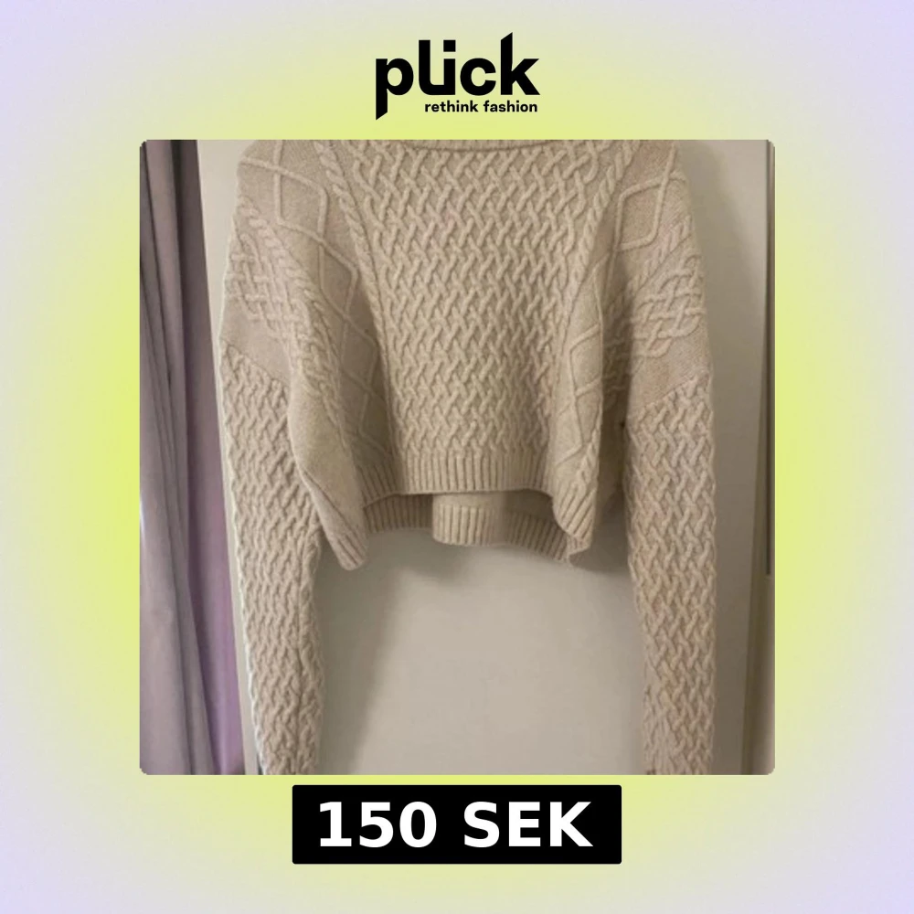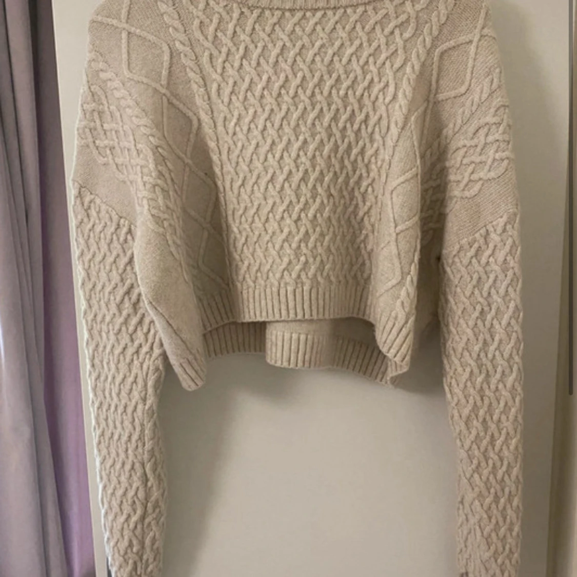 Superfin beige stickad tröja från H&M med grovt flätmönster och ribbade muddar. Modellen är croppad och har lång ärm, perfekt för lager-på-lager under kyliga dagar. Snygg till både jeans och kjol!