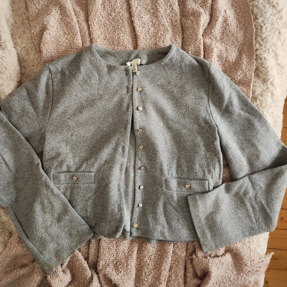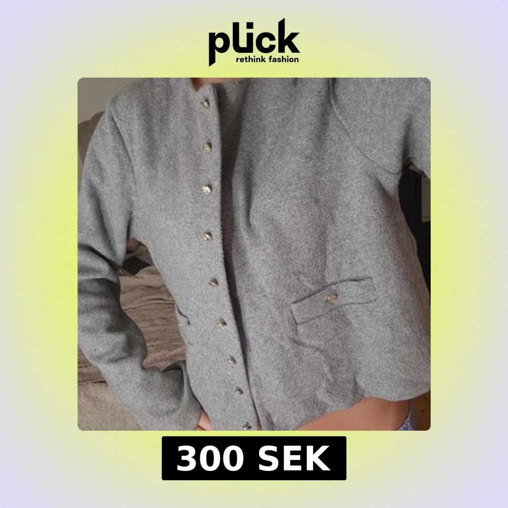 Stilren grå ullkofta från H&M med rund halsringning. Jackan har dekorativa guldknappar framtill och två fickor. Perfekt för dig som gillar en clean och klassisk look med en twist.