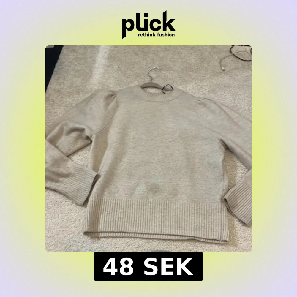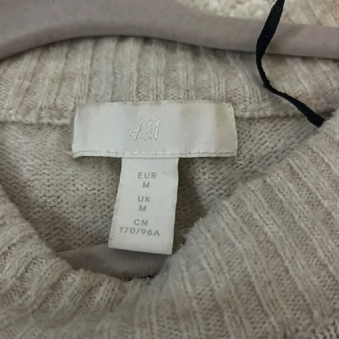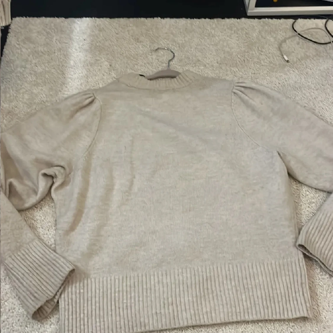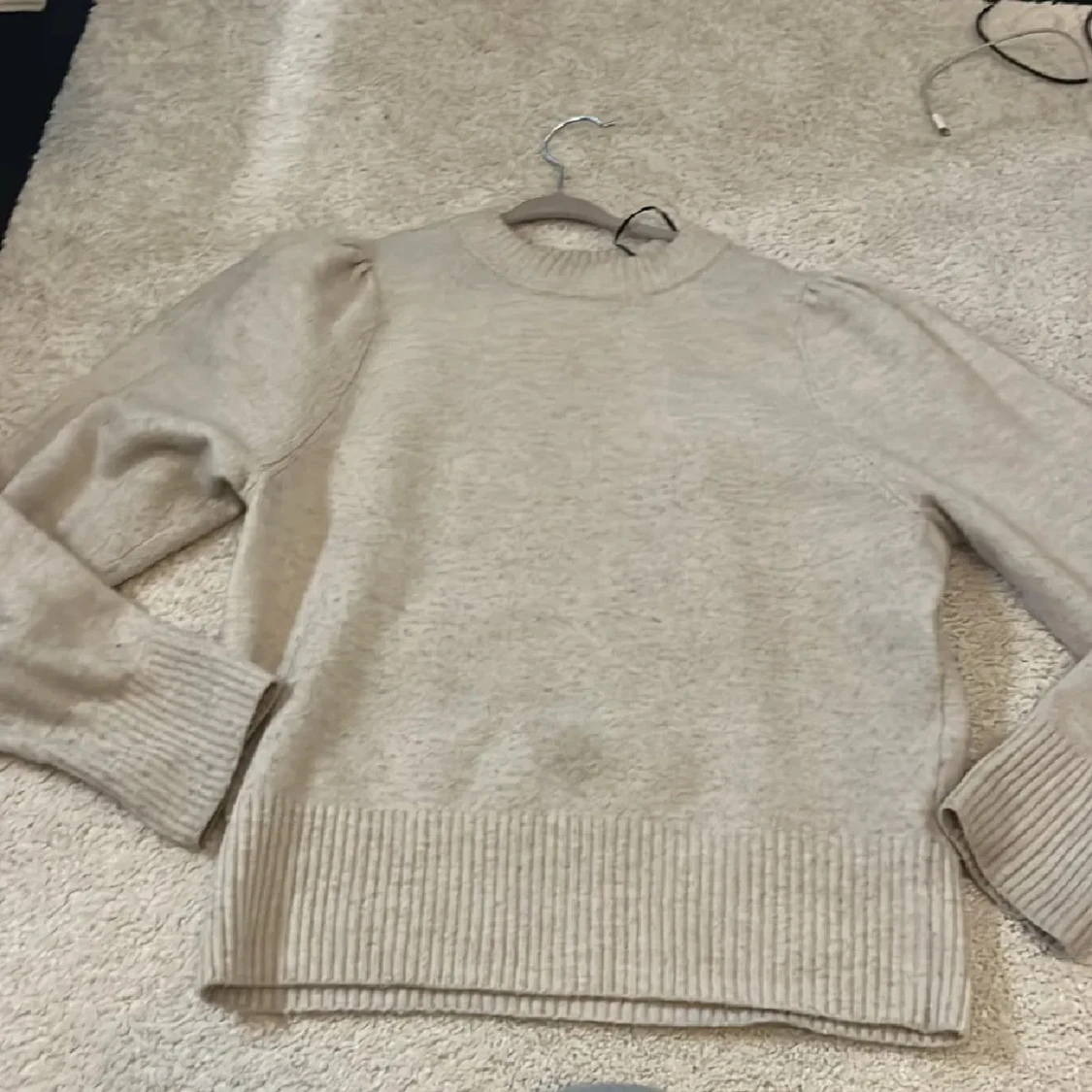 Säljer en beige stickad tröja från H&M i storlek M. Tröjan har puffade axlar, ribbade muddar och en klassisk rund halsringning. Perfekt för lager-på-lager och chill höst- eller vinterstil.