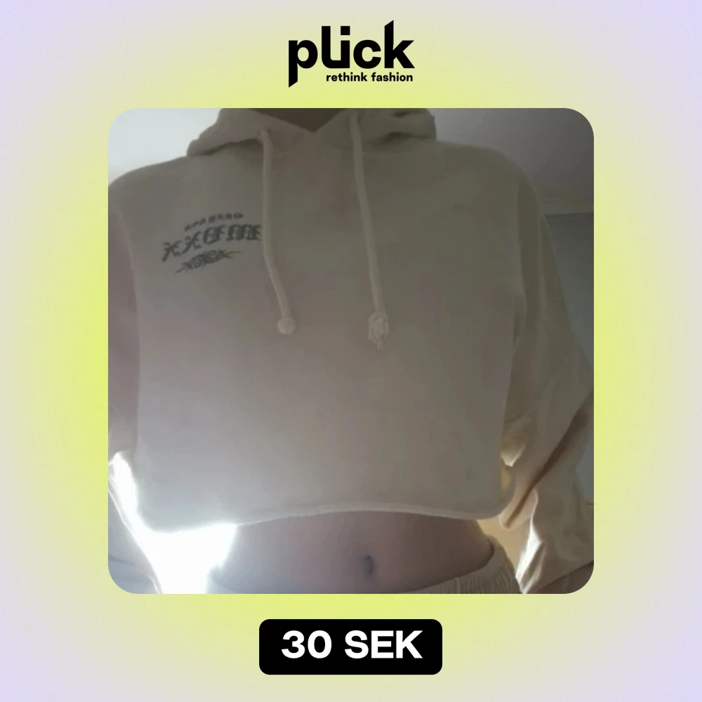 Säljer en supercool beige croppad hoodie med tryck både fram och bak. Den har en luva och dragsnören, perfekt för en avslappnad stil. Trycket på ryggen är riktigt unikt och ger en edgy vibe. Perfekt för höst och vår!