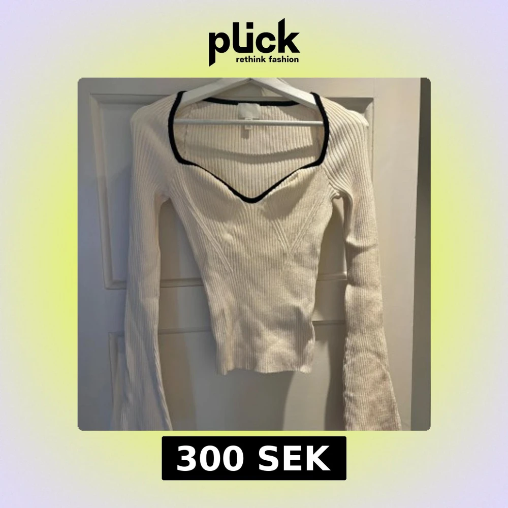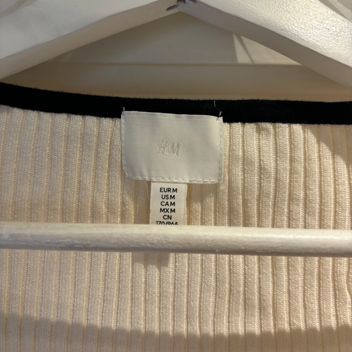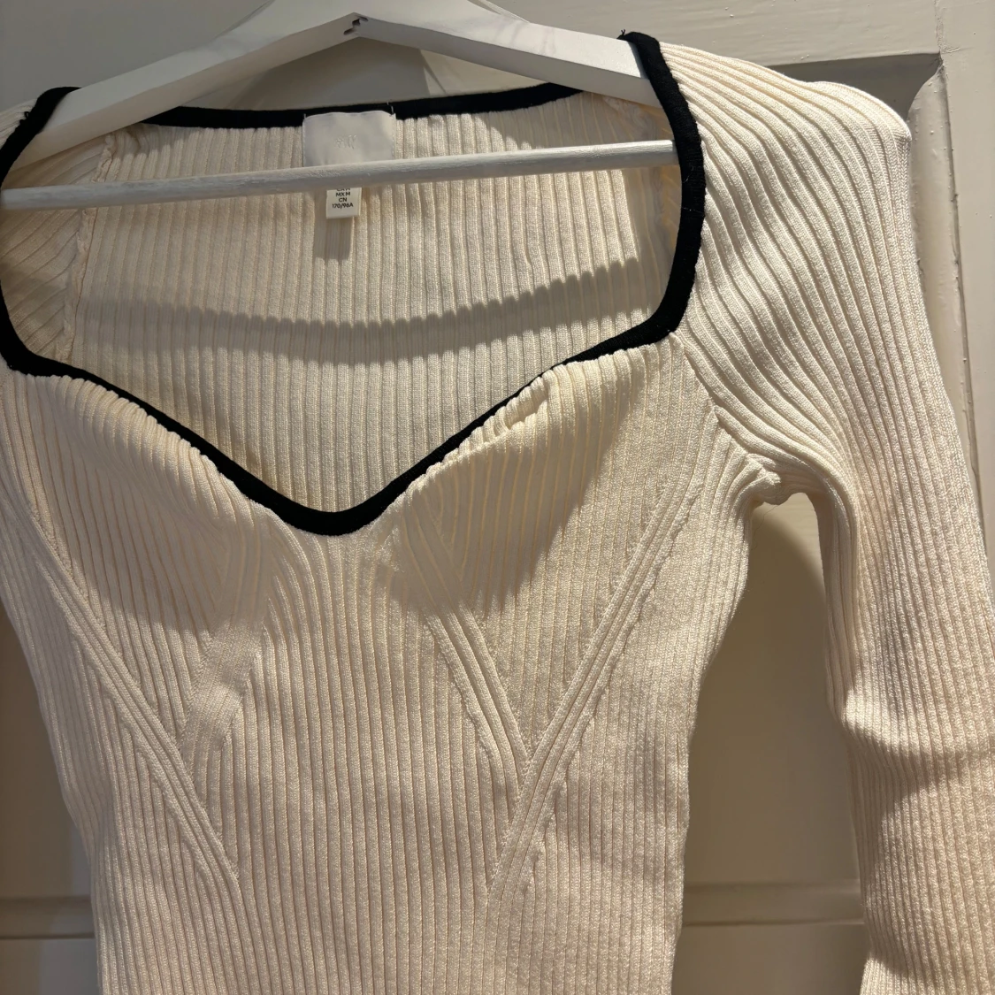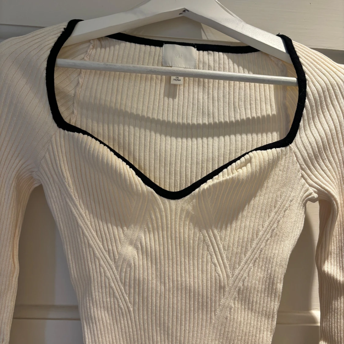 Säljer en ribbad, figurnära vit långärmad topp från H&M med svart kant runt den djupa v-ringningen. Tröjan har markerade sömmar framtill och är stretchig och mjuk, med utsvängd arm.