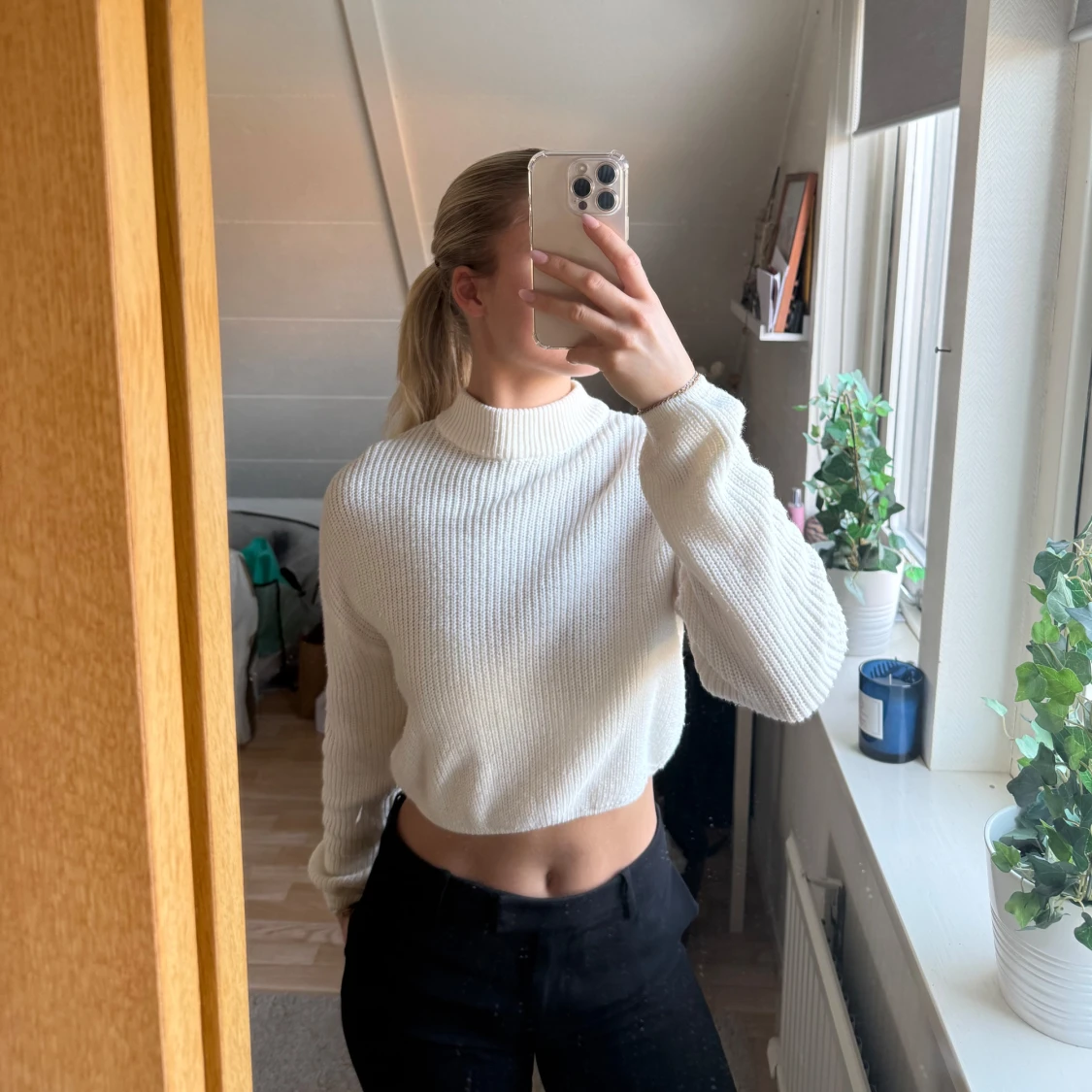 Säljer en stilren vit ribbad tröja med croppad passform. Tröjan har långa ärmar och en hög krage.🤍