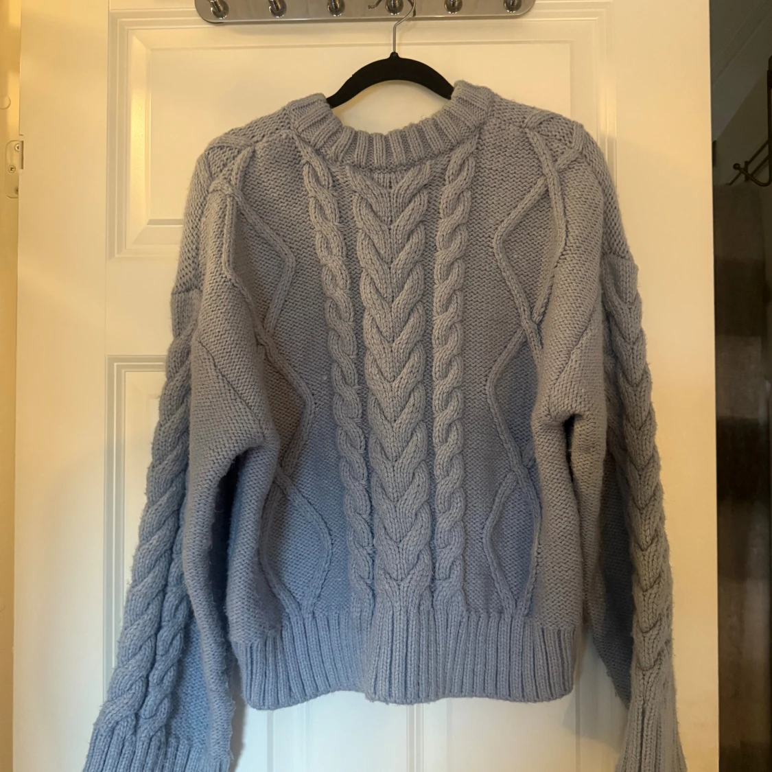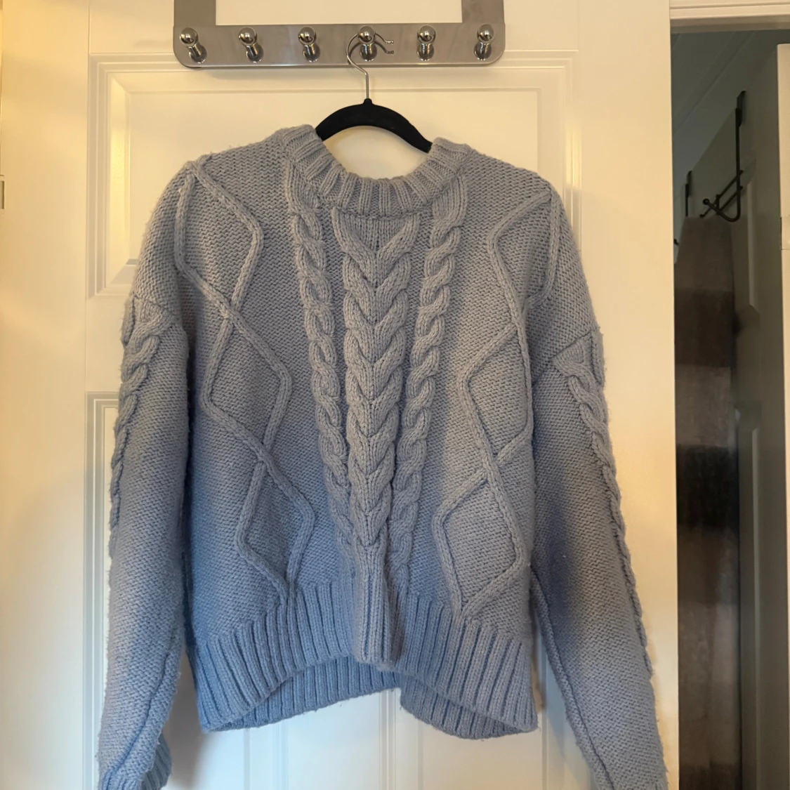 Supermysig ljusblå stickad tröja med grova kabelstickade detaljer och ribbade muddar. Tröjan har en klassisk rund halsringning och långa ärmar. Perfekt för kyliga dagar när du vill vara både varm och snygg.