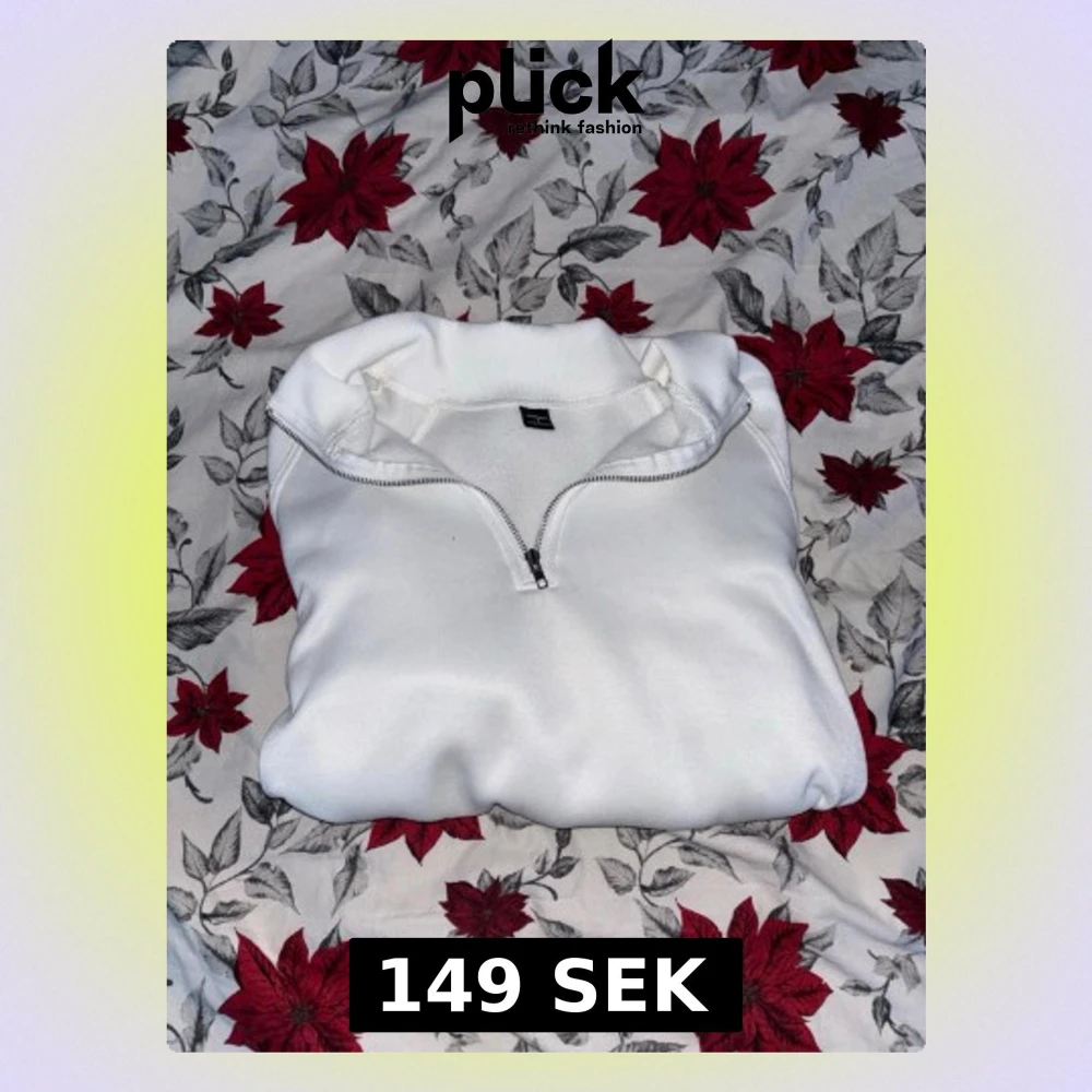 Säljer en fräsch vit sweatshirt från H&M med half zip-dragkedja och hög krage. Tröjan har långa ärmar och ribbade muddar vid ärmslut och nederkant. Perfekt för chill dagar och enkel att matcha med jeans eller mjukis.