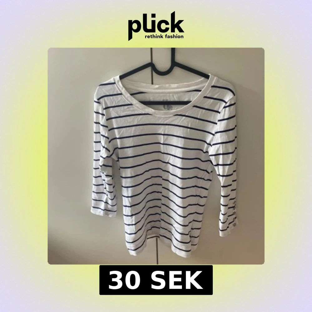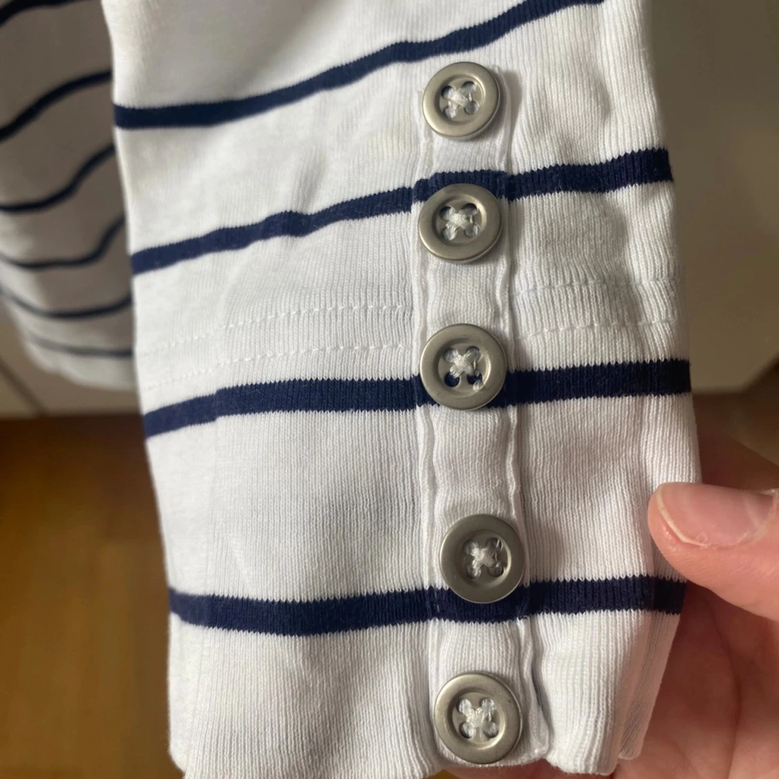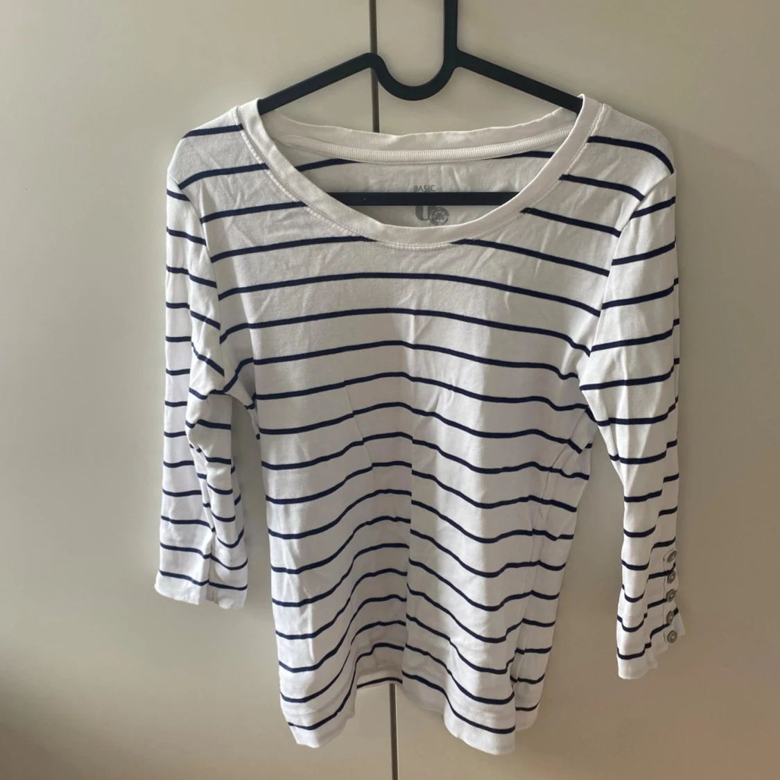 Vit topp med marinblå ränder från H&M. Trekvartsärm med snygga knappar vid ärmslutet. Mjuk och skön bomullskvalitet, perfekt för vår och sommar. Enkel och stilren design som passar till det mesta.