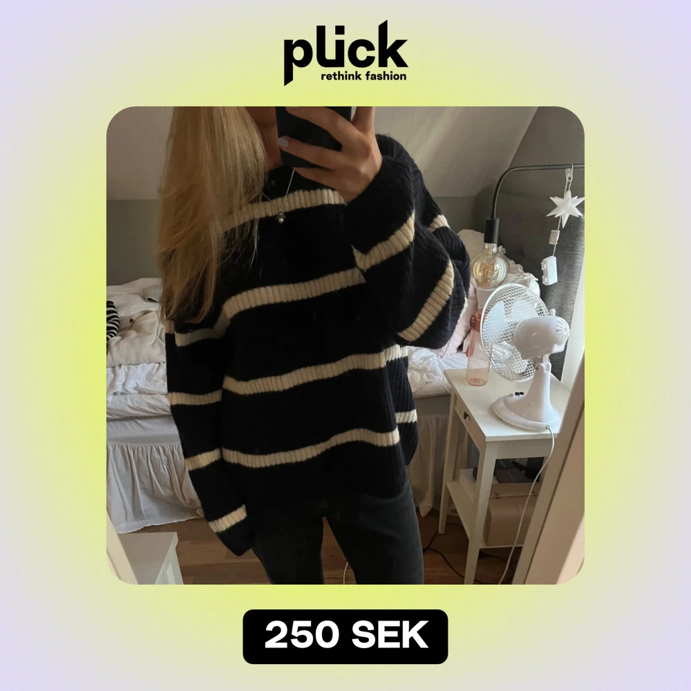 Mysig och oversized svart stickad tröja med vita ränder. Storlek XL men passar bra på mig som brukar ha ca M💕 oanvänd
