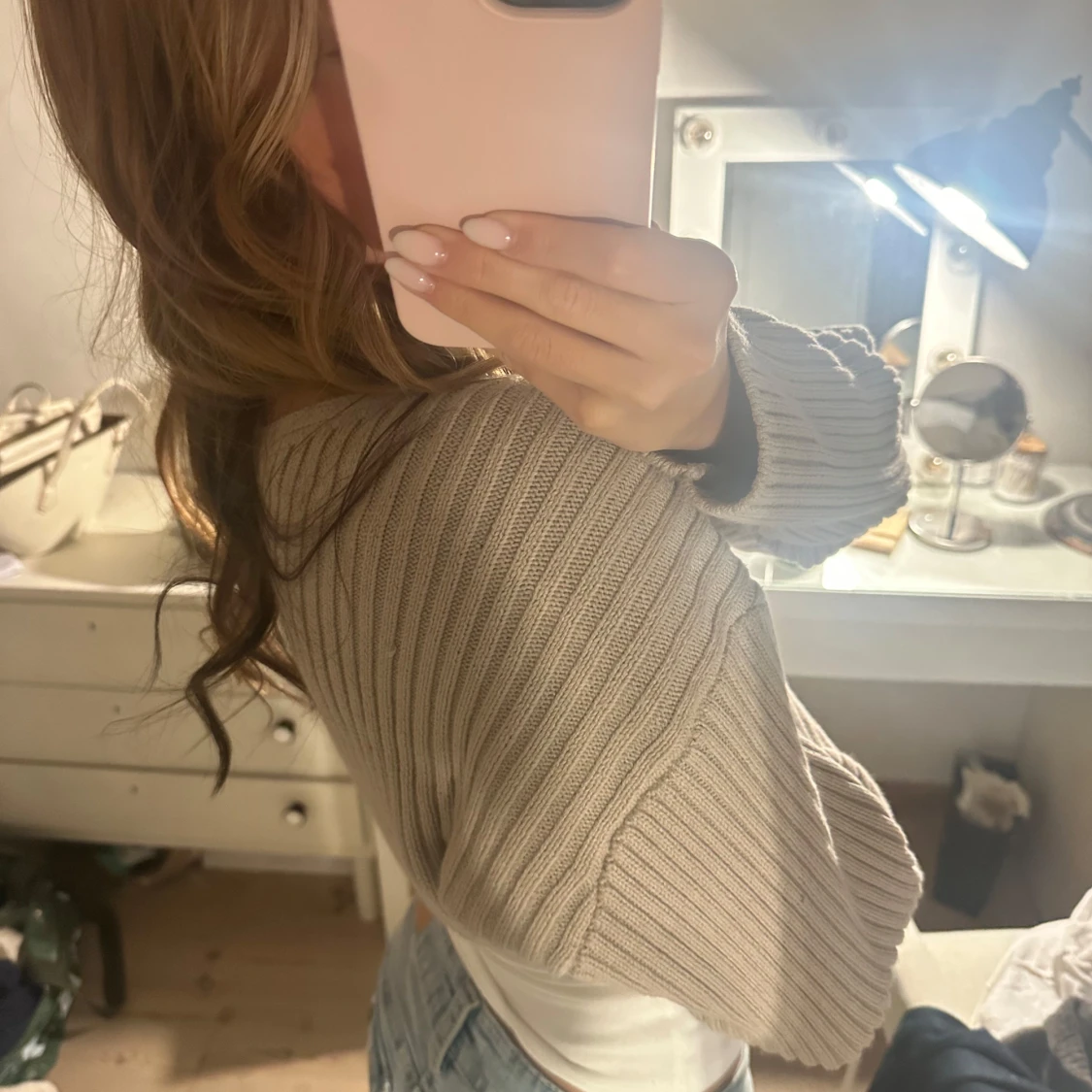 Säljer en snygg beige ribbad bolerotopp med långa ärmar.