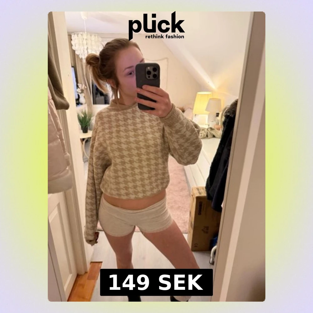 Supermysig beige stickad tröja från H&M i storlek XS. Tröjan har ett klassiskt hundtandsmönster i beige och vitt, ribbade muddar och avslappnad passform. Perfekt för höst och vinter när man vill vara både snygg och bekväm.