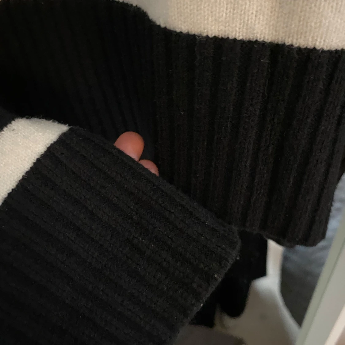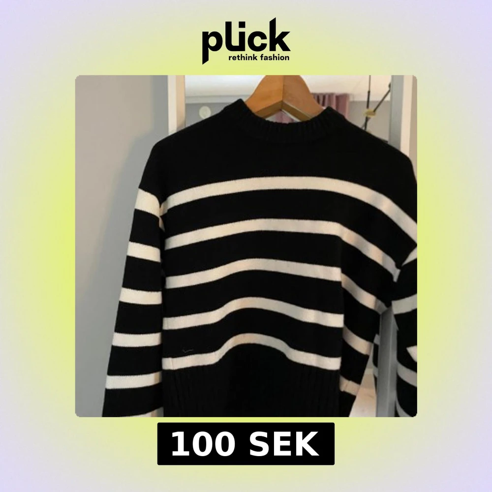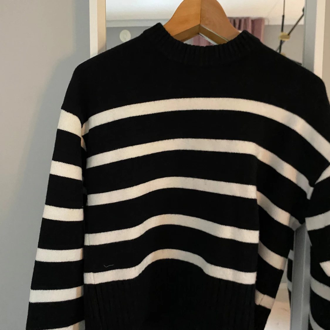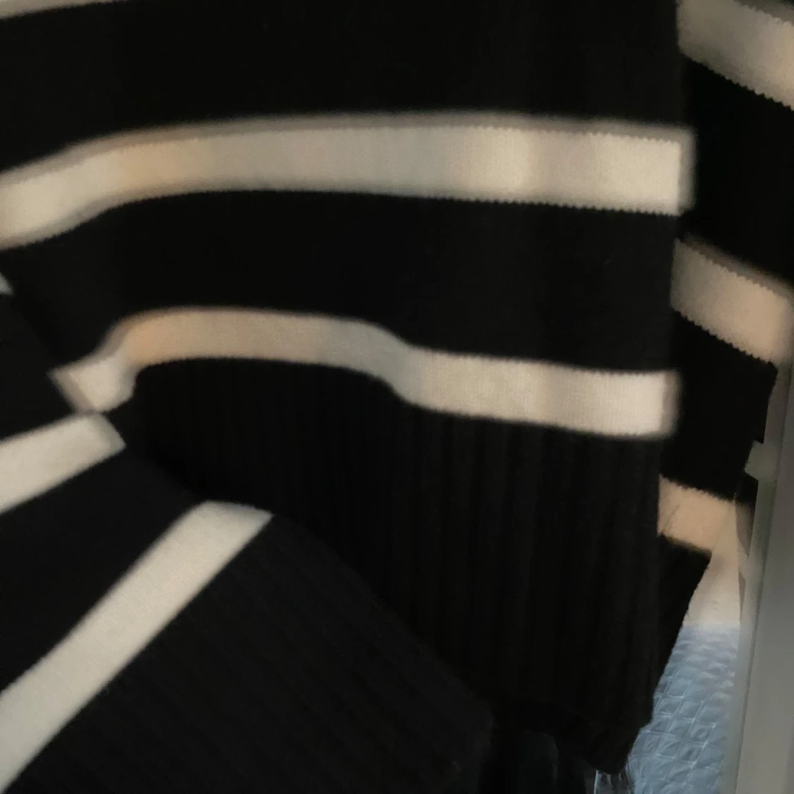 Snygg svart stickad tröja från H&M i storlek XS med breda vita ränder. Tröjan har ribbade muddar vid ärmslut och nederkant samt en klassisk rund halsringning. Perfekt för dig som gillar en enkel men trendig look. Står ej för postens slarv Köpt är köpt, gär ej att returneras. Pris går att diskuteras