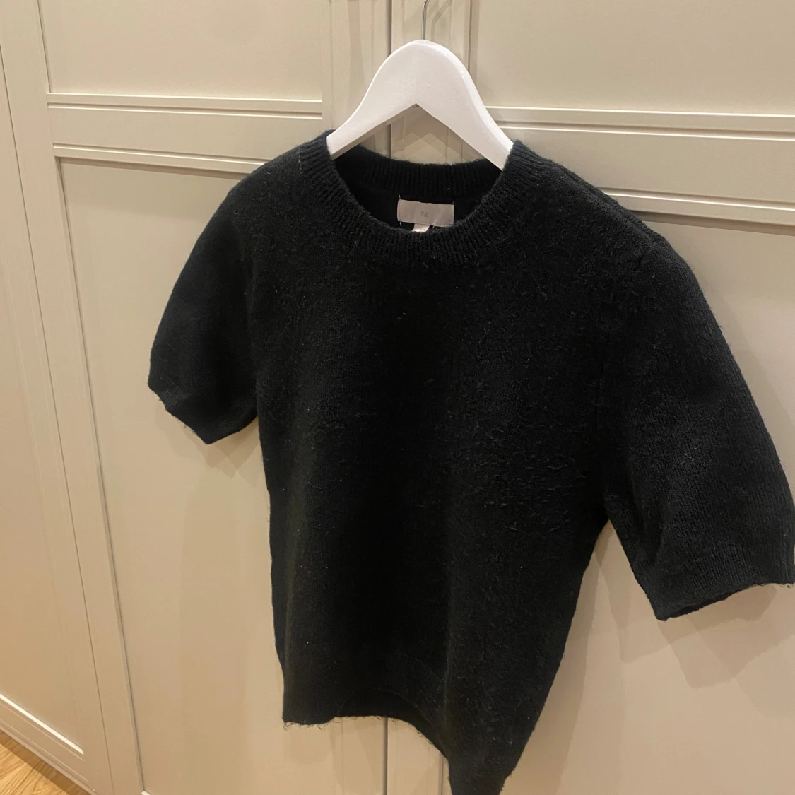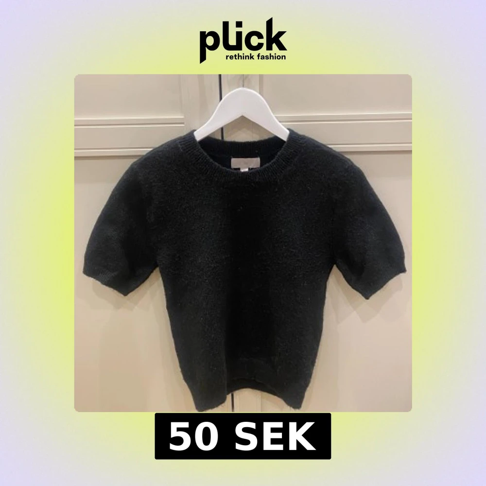En svart stickad tröja från H&M i storlek XS. Tröjan har korta ärmar, rund halsringning och en klassisk, enkel design. Perfekt för lager-på-lager och funkar året runt. Mjuk och skön känsla tack vare det stickade materialet.