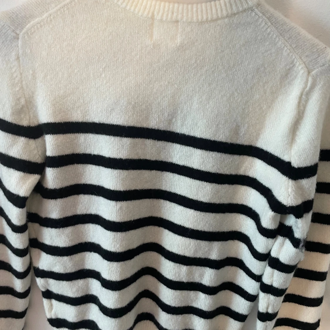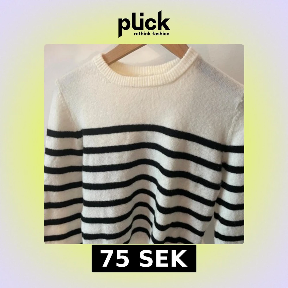 Supermysig stickad tröja från H&M i vitt med svarta horisontella ränder. Klassisk rund halsringning och långa ärmar. Perfekt för lager-på-lager och chill dagar. Mjuk och skön känsla, passar dig som gillar enkel men snygg stil. Säljer av ingen andvändning!