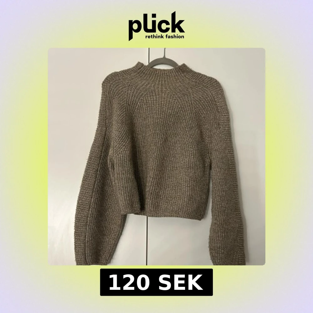 Säljer en mysig beige stickad tröja med hög krage. Tröjan har en croppad passform och långa ärmar, perfekt för kyliga dagar. Den ribbade strukturen ger en stilren look. Perfekt för höst och vinter!