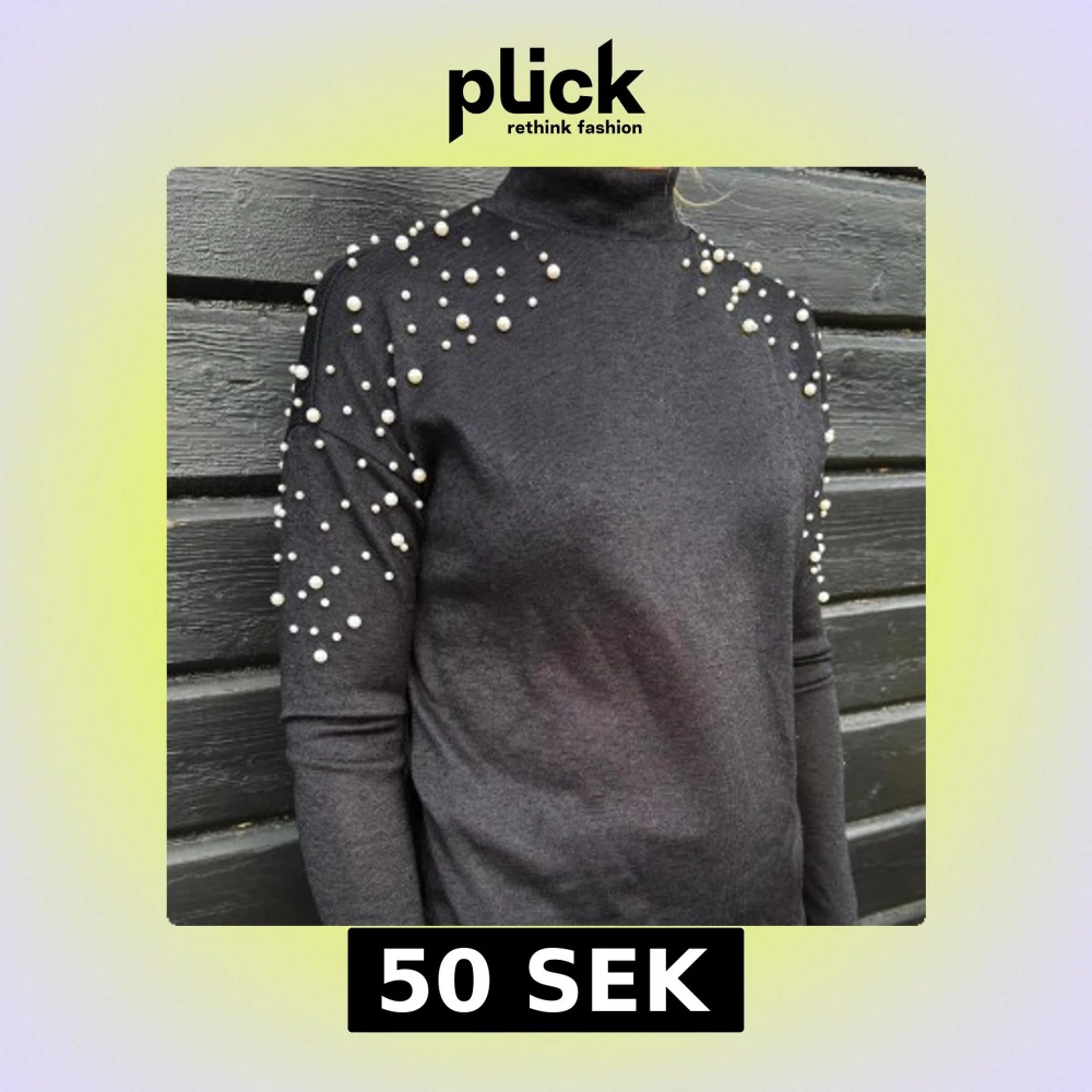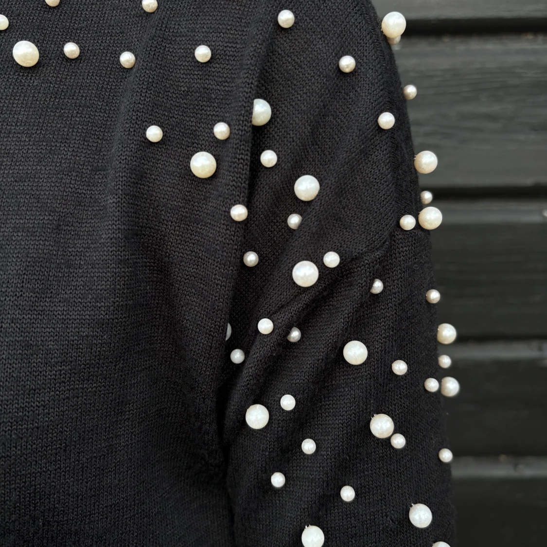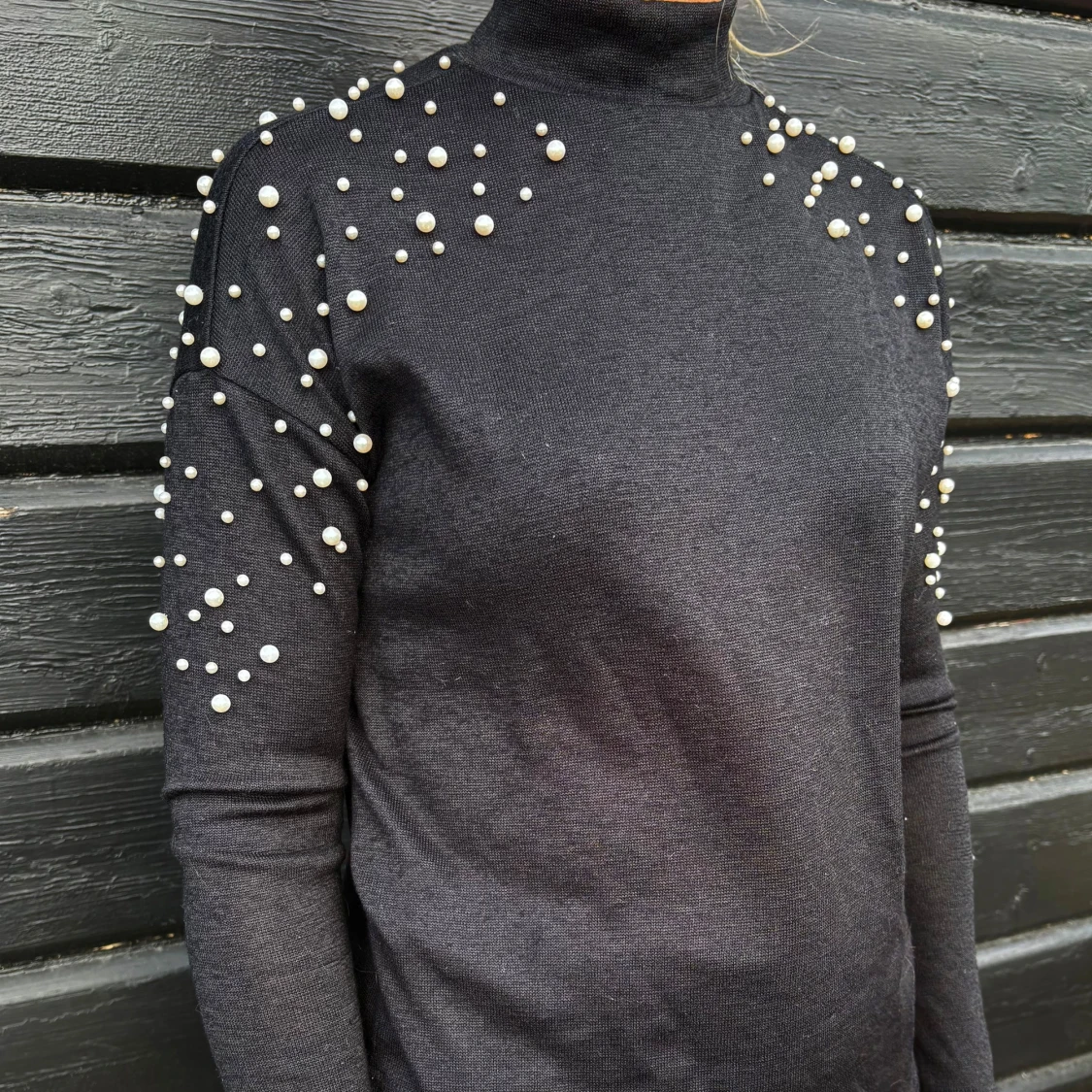 Svart polotröja med lång ärm och coola pärldetaljer på axlar, ärmar och nederkant. Tröjan har en hög krage och är stickad i mjukt material som känns skönt mot huden. Perfekt för dig som gillar att sticka ut med snygga detaljer. XS från H&M
