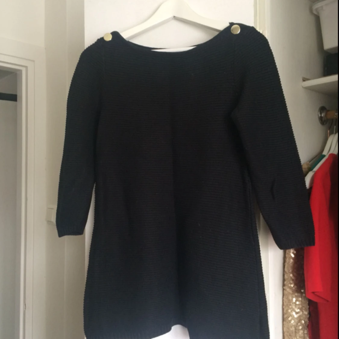 Båtringad svart ribbstickad tröja med trekvartsärm och guldknappar på axlarna