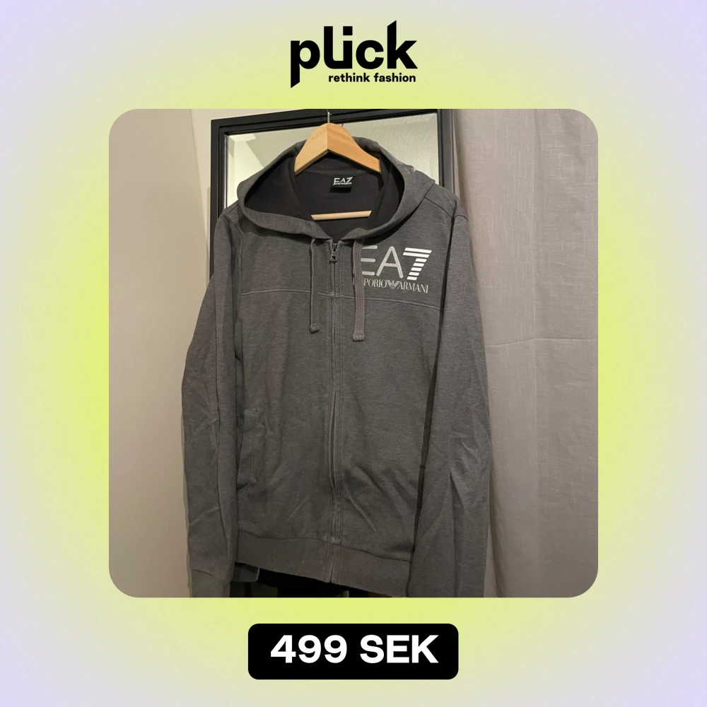 Säljer en snygg grå hoodie från Emporio Armani i storlek S passar även M. Den har en dragkedja framtill och en logga på bröstet. Perfekt för en casual look och funkar även som unisex. Den är i bra skick och superbekväm att ha på sig.