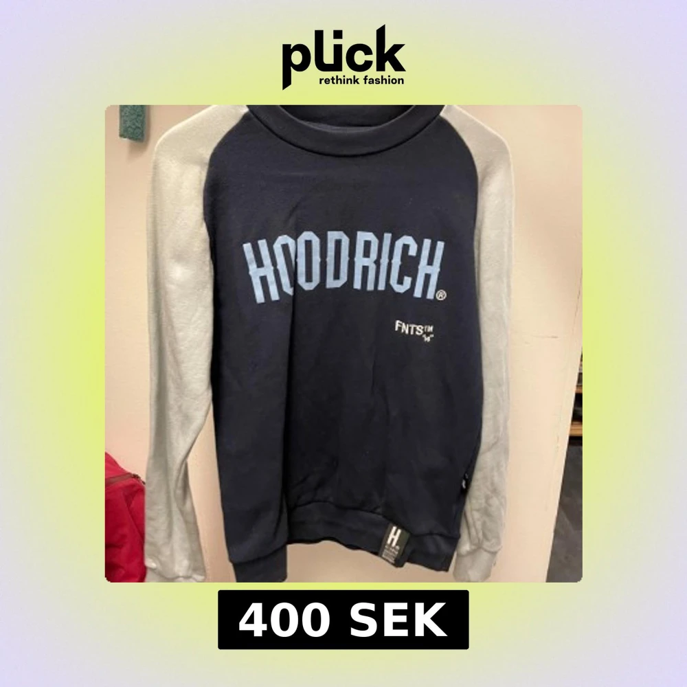 Säljer en blå dress från Hoodrich med textdetaljer på både fram- och baksidan. Tröjan har en avslappnad passform och är perfekt för en casual look.