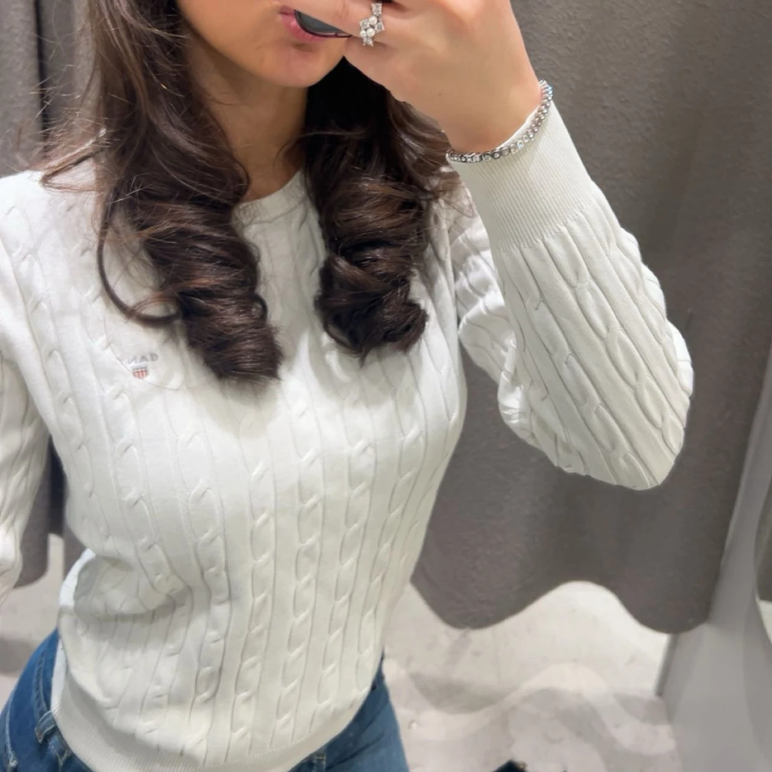 Vit kabelstickad tröja från Gant med diskret logga på bröstet. I fint skick, sitter fint på kroppen- åtsittande till skillnad från dem flesta gant tröjor. Denna är en vintage, men inte använts mycket. Kontakta INNAN köp 🩷