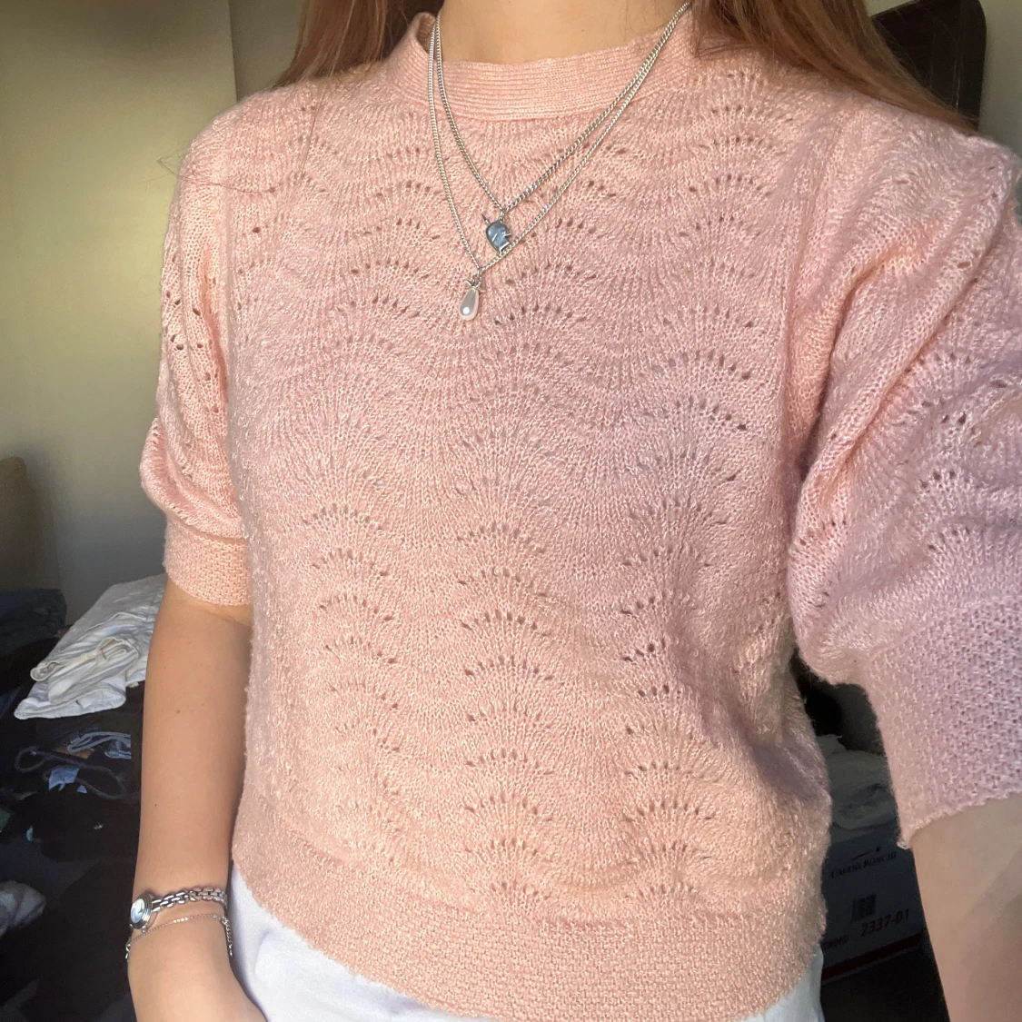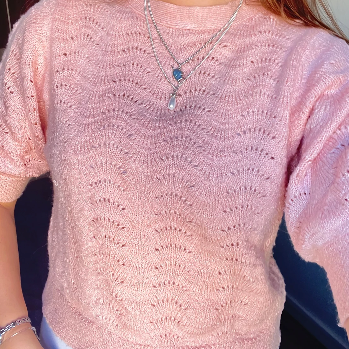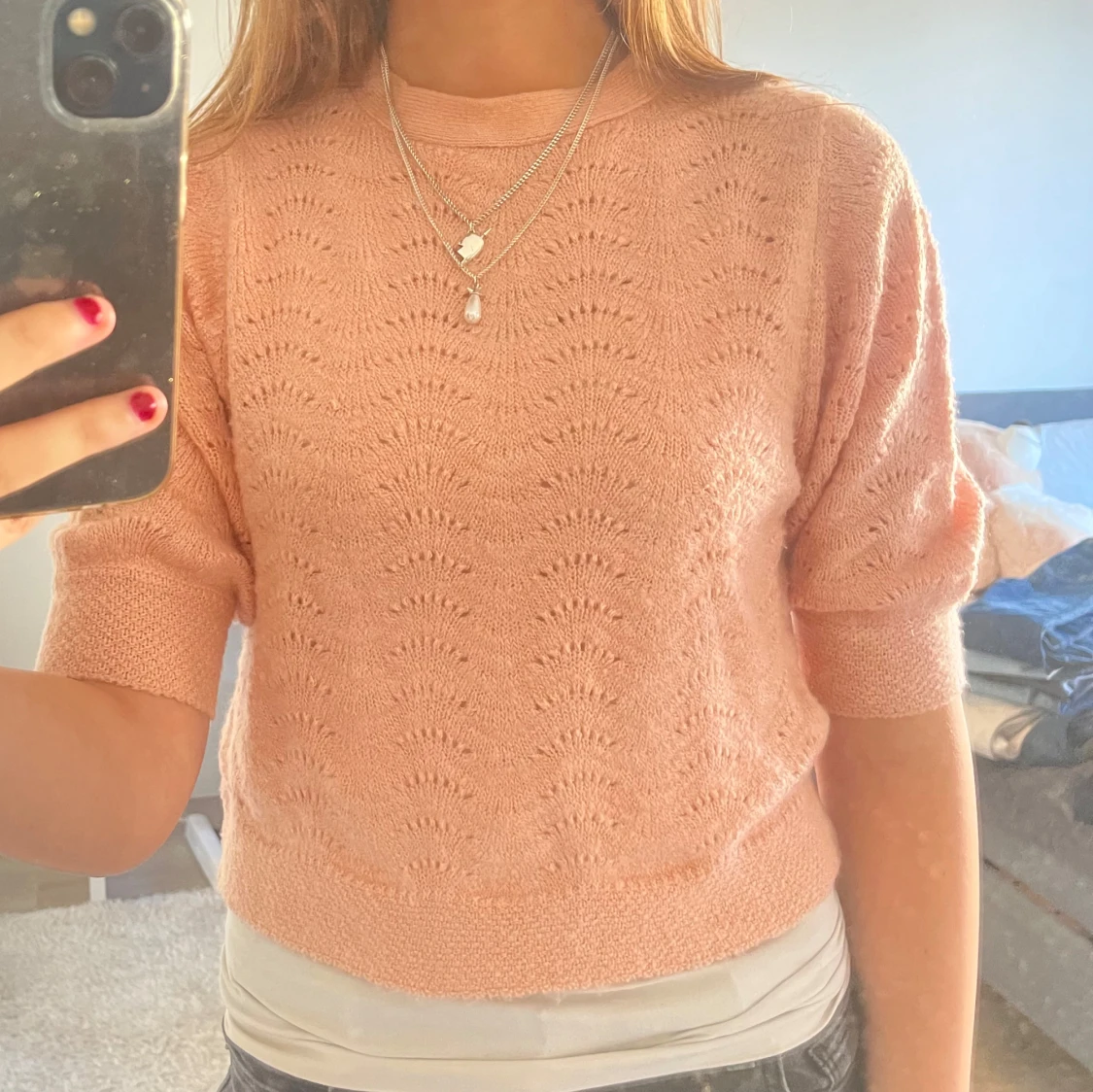 Superfin ljusrosa stickad tröja med korta ärmar och vågigt hålmönster över hela. Tröjan har en rund halsringning och ribbade muddar vid ärmslut och nederkant. Perfekt för hösten
