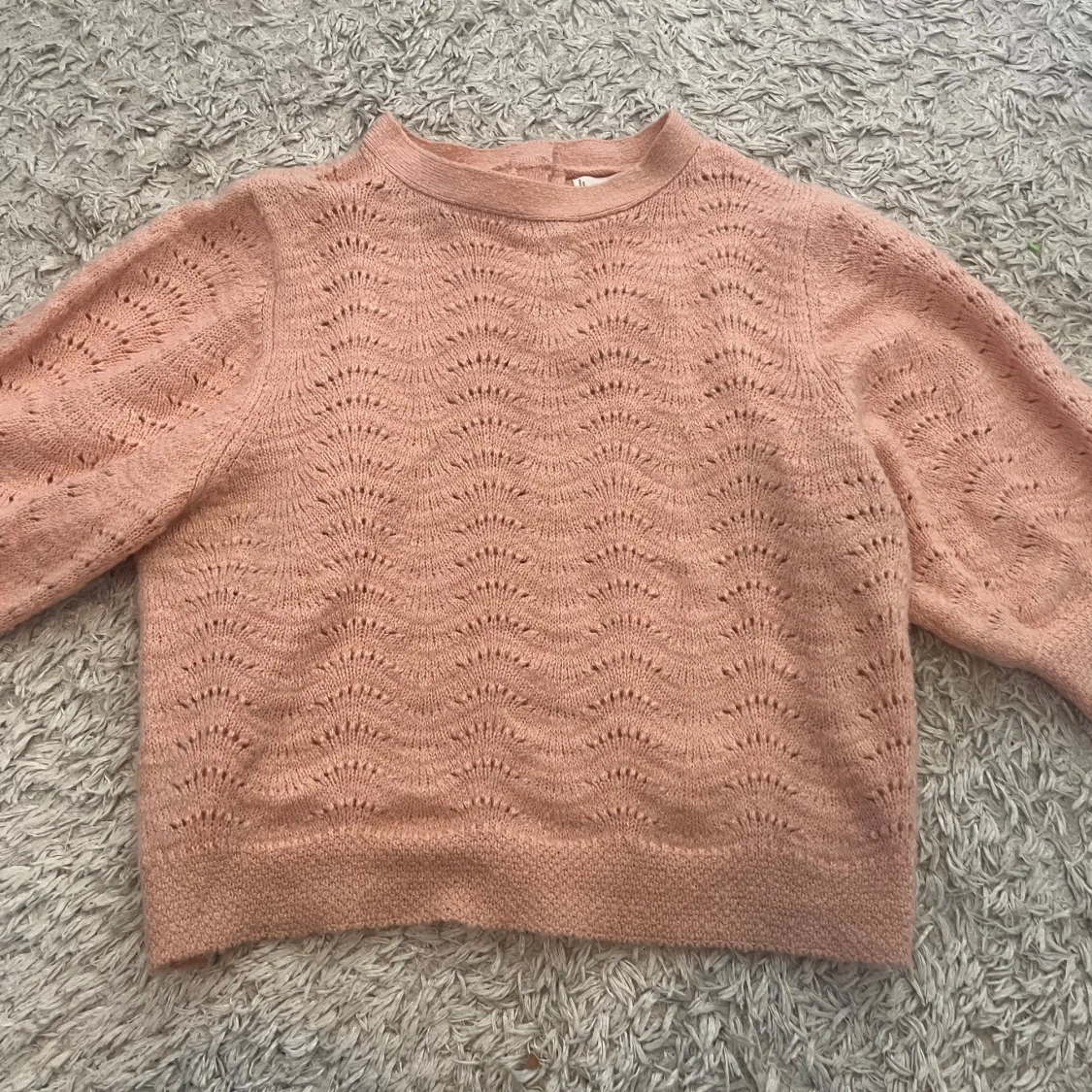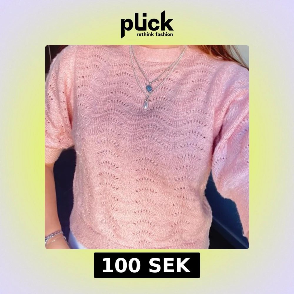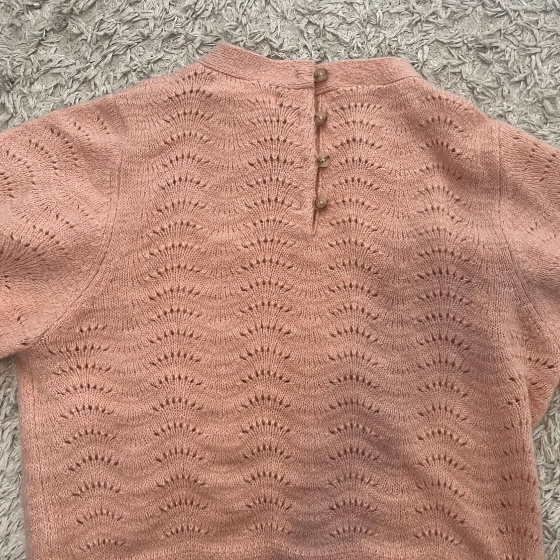 Superfin ljusrosa stickad tröja med korta ärmar och vågigt hålmönster över hela. Tröjan har en rund halsringning och ribbade muddar vid ärmslut och nederkant. Perfekt för hösten