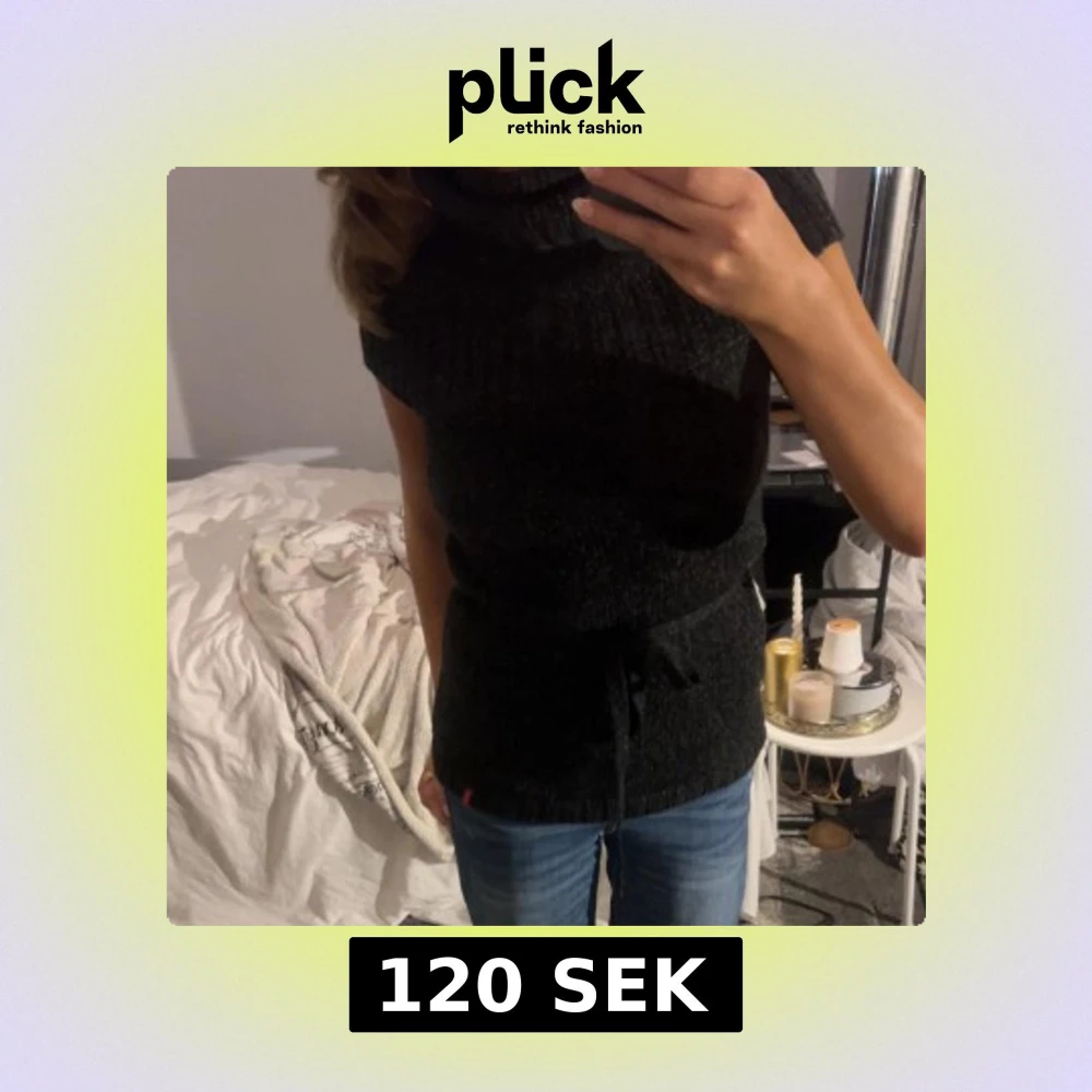 Mysig svart stickad polotröja utan ärmar och med bred krage. Tröjan har ett knytband i midjan som ger en snygg siluett. Perfekt att styla med jeans eller kjol för en chill men ändå uppklädd look.