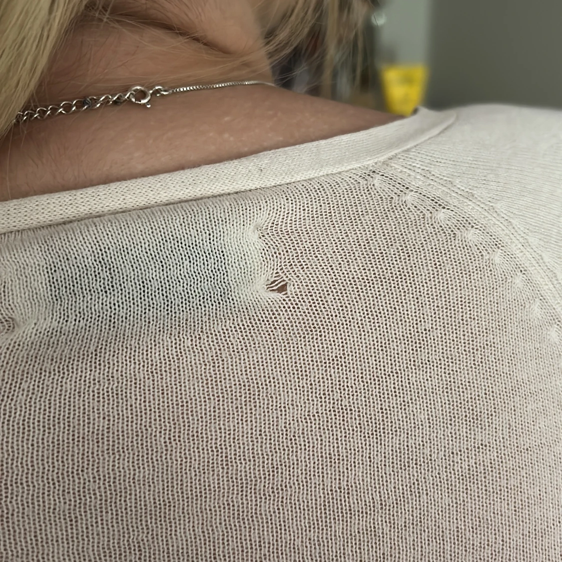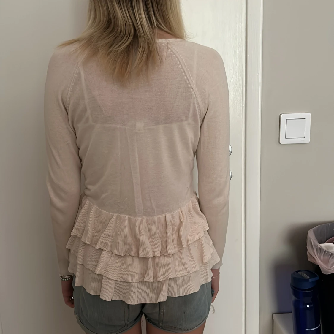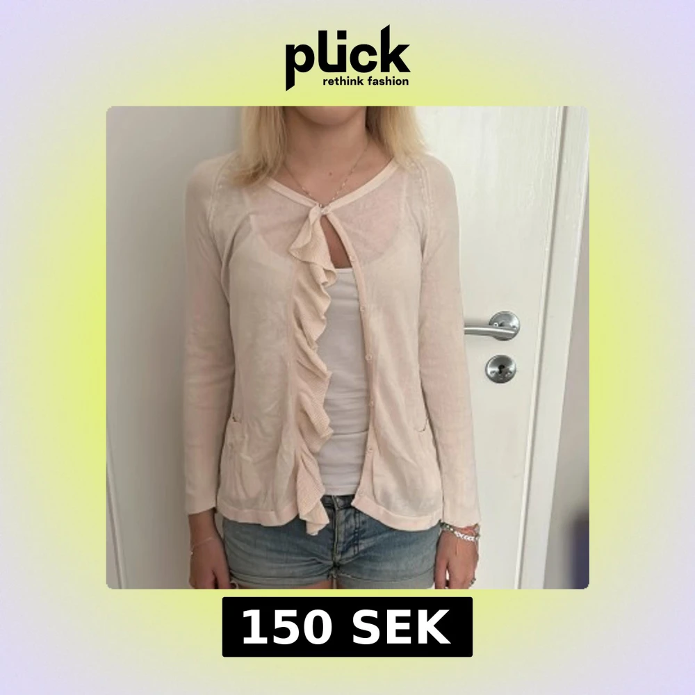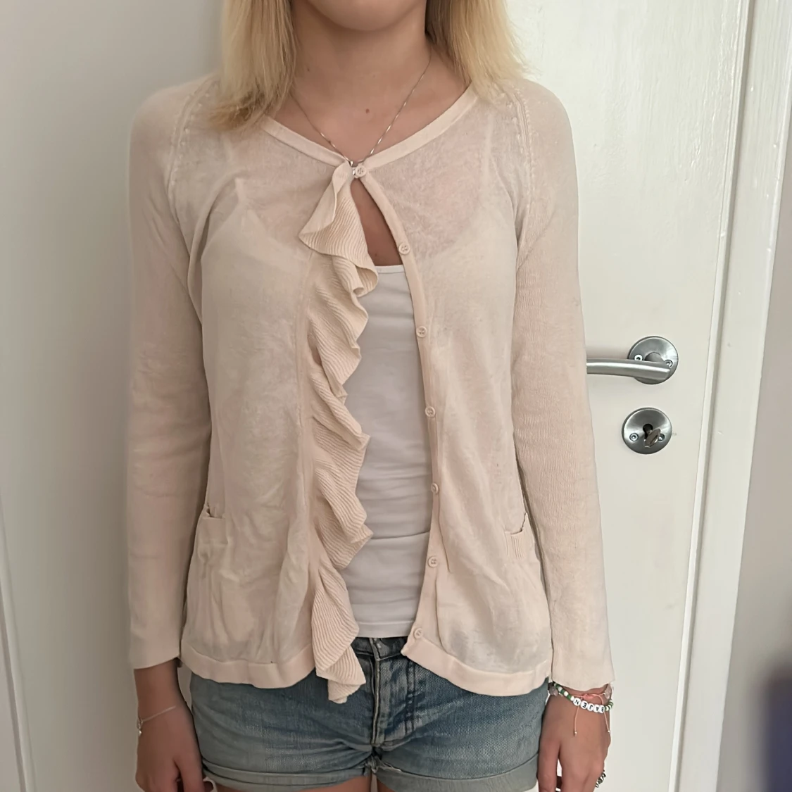 Supersöt beige kofta med volang, flera lager volanger baktill. đ©·Tunn och lĂ€tt stickad med lĂ„ng Ă€rm och smĂ„ fickor. StĂ„r ej storlek men skulle gissa pĂ„ xs/s. Litet slitage vid lappen, se bild 3. 100% cottonđPris gĂ„r att diskuteras.