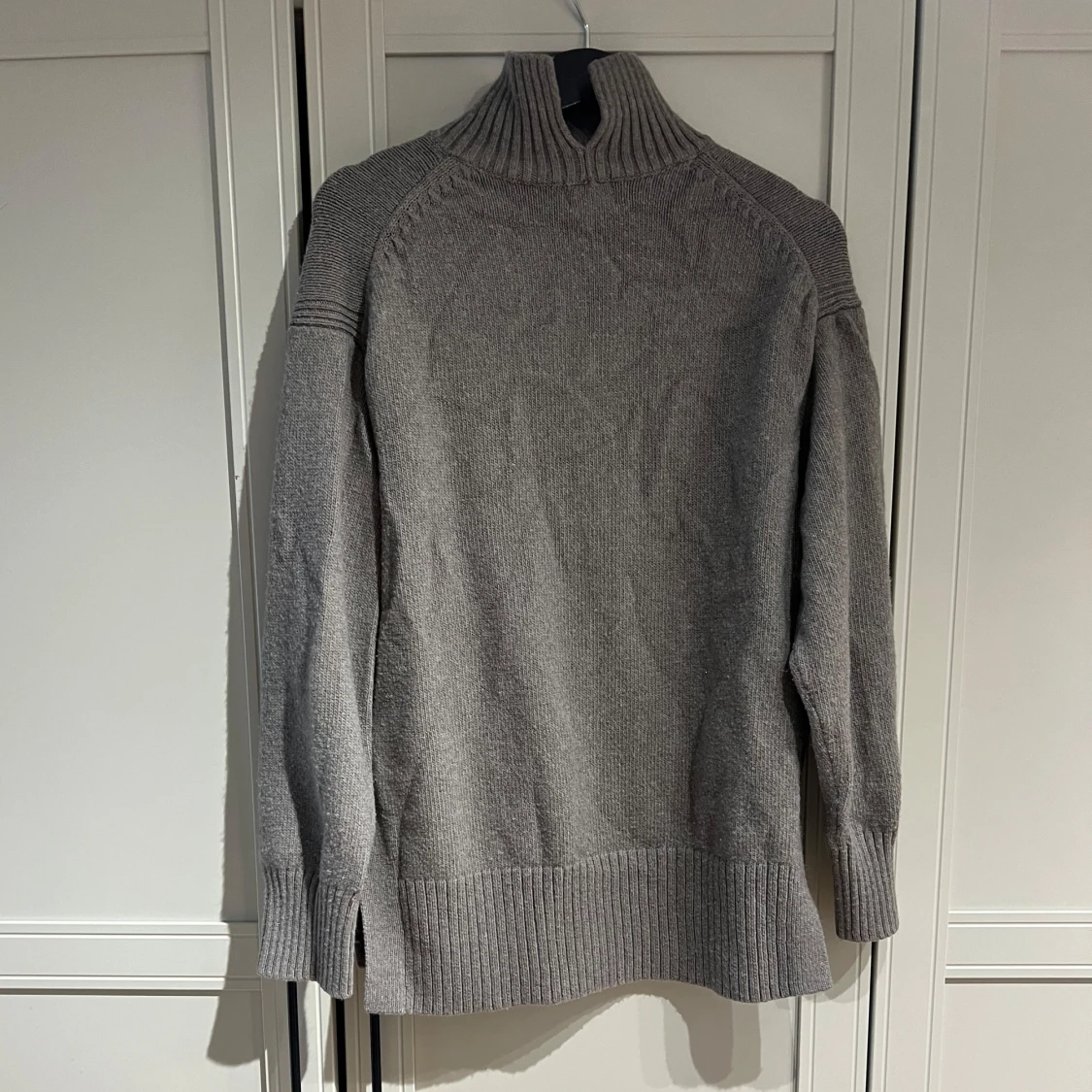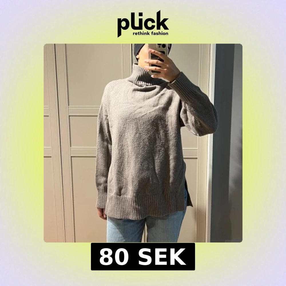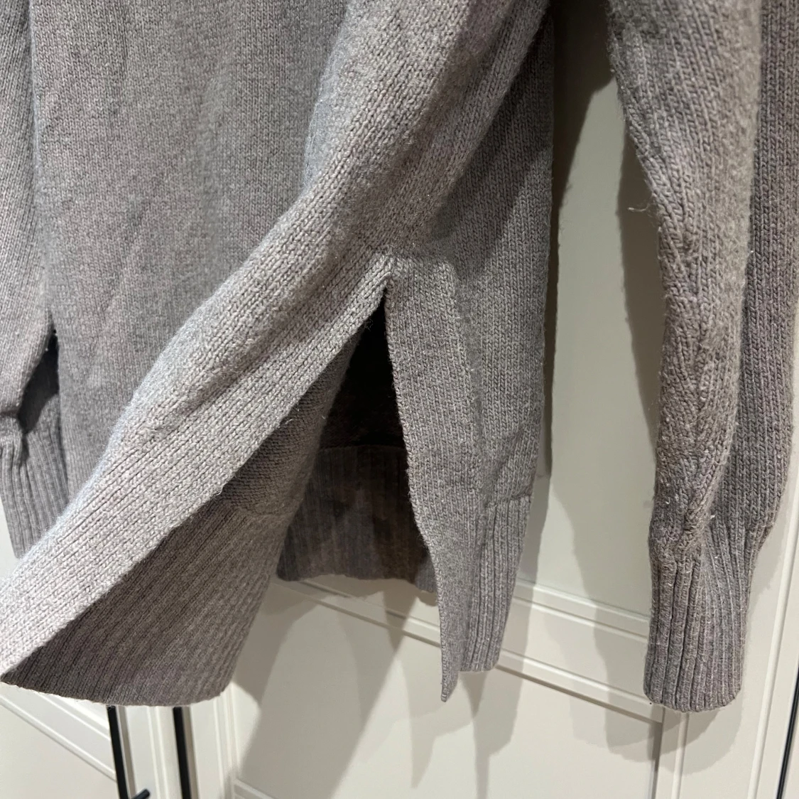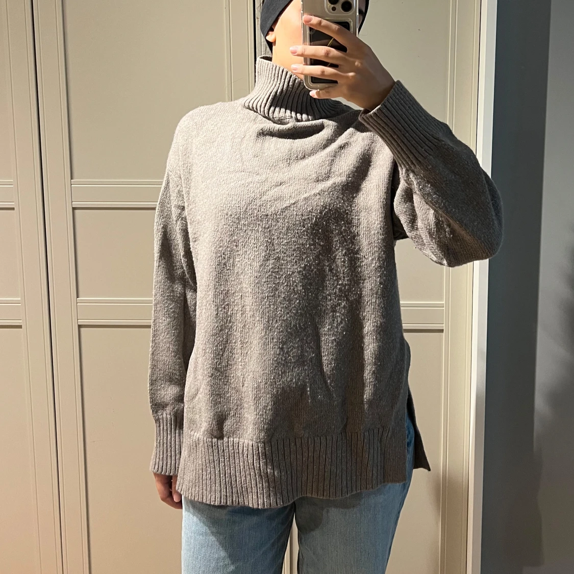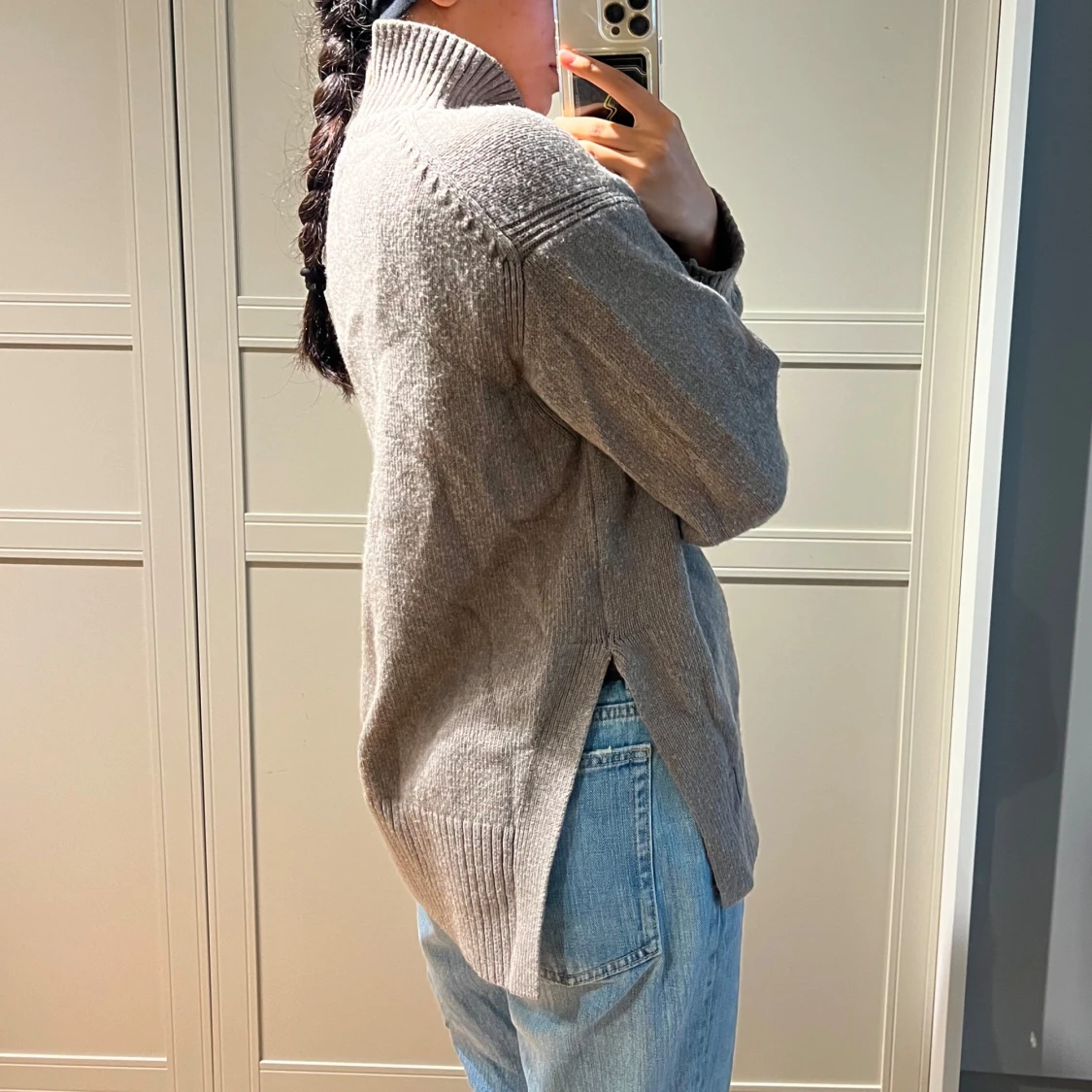 Stickad polotröja från H&M med slits på sidorna och en liten slits i nacken. Färgen är en blandning av grått och beige. Materialet är mjukt och varmt. Fortfarande i bra skick men något nopprig och lite skrynklig efter tvätt.