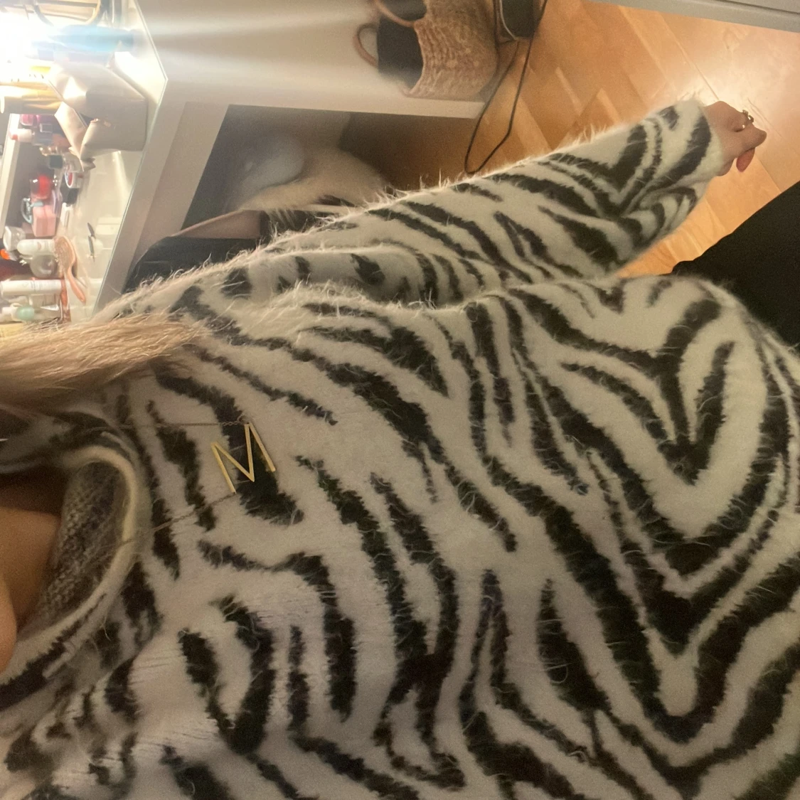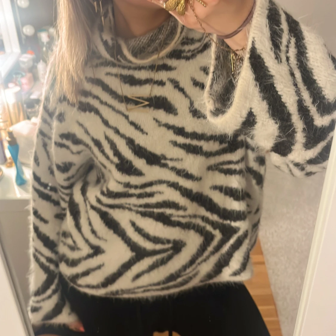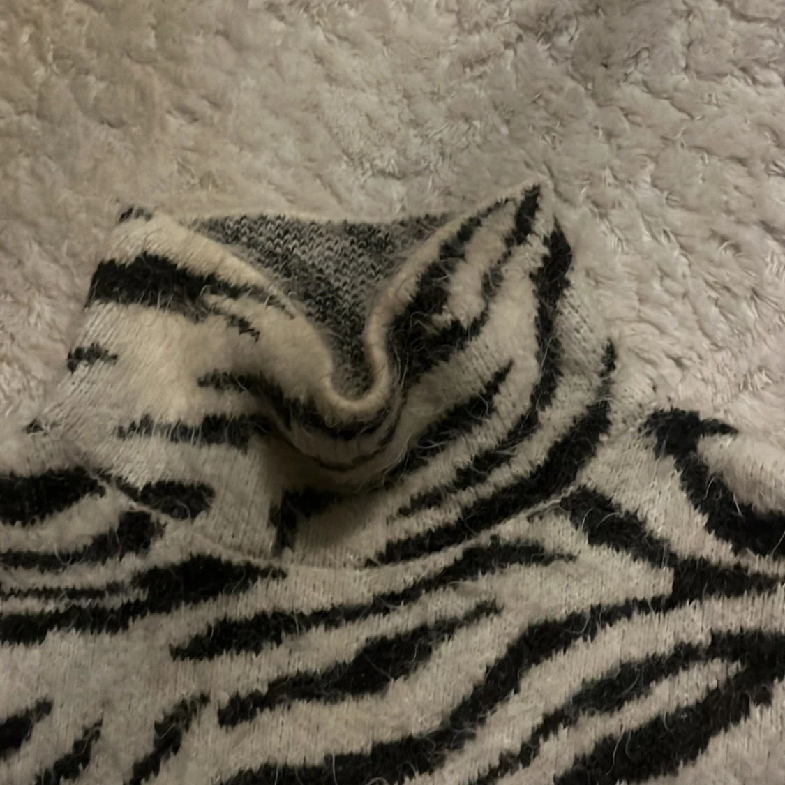 Säljer en fluffig och mysig polotröja från H&M i storlek S. Tröjan har ett svartvitt zebramönster, hög polokrage och är stickad i ett mjukt material. Säljer då ja inte gillar så höga kragar, priset går att diskuteras💕