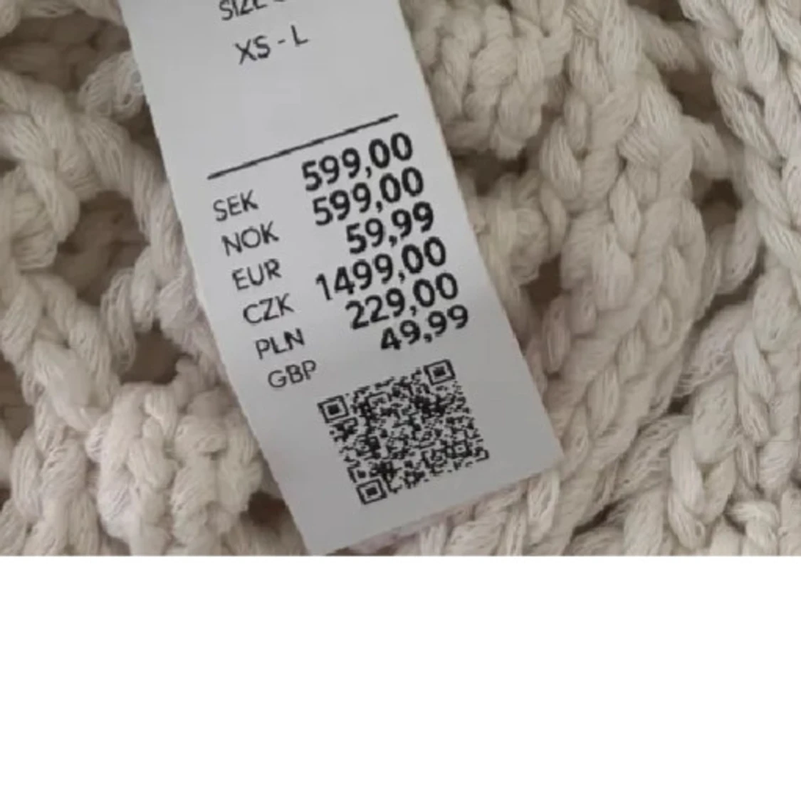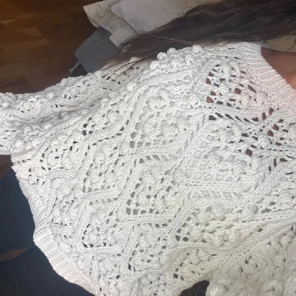 Superfin vit stickad tröja med grovt virkat mönster och snygga detaljer. Tröjan har lång ärm, rund halsringning och en loose fit som ger en chill vibe. Perfekt att slänga på sig när det är lite kyligare ute.