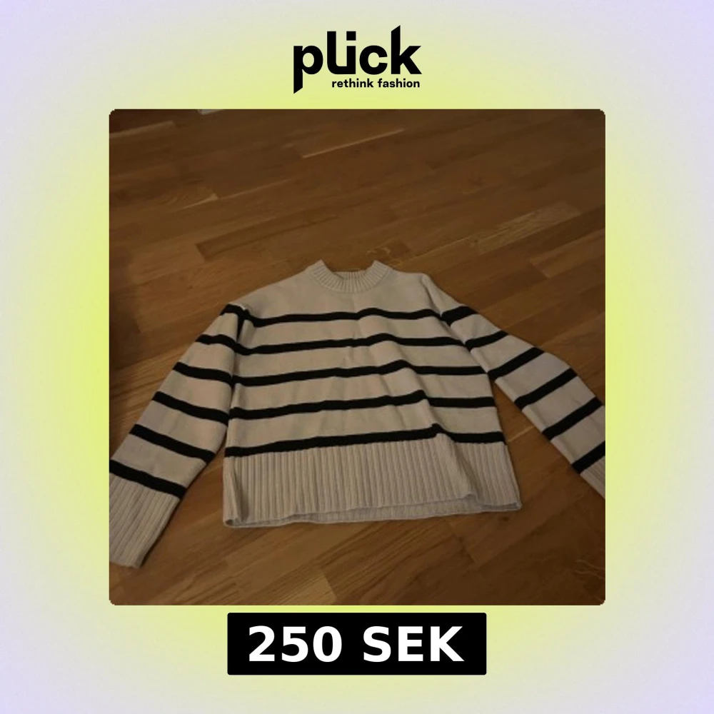 Säljer en vit stickad tröja från H&M i storlek XS med svarta horisontella ränder. Tröjan har ribbade muddar och nederkant samt rund halsringning. Perfekt för dig som gillar en klassisk och chill stil. Mycket bra skick