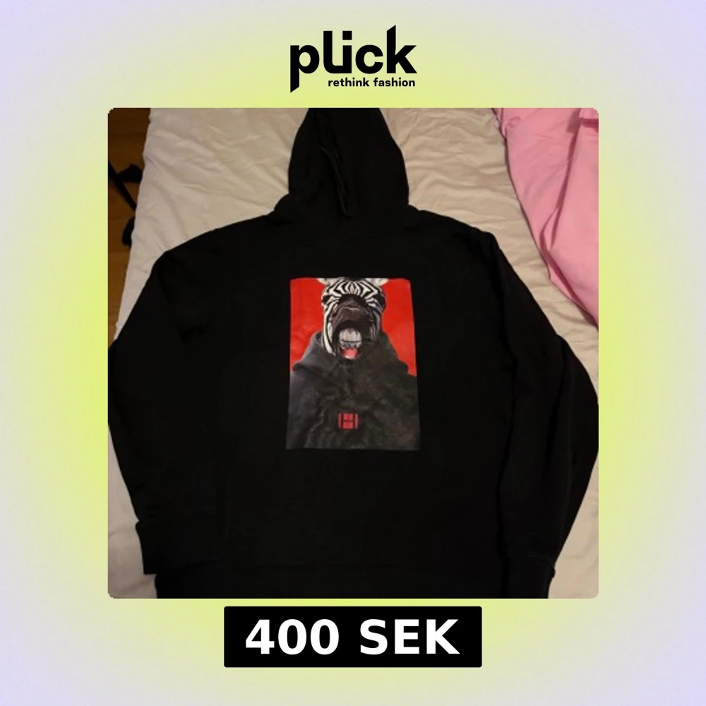Svart hoodie från Hugo med stor, färgstark print på bröstet som visar en zebra med cool attityd mot röd bakgrund. Tröjan har huva och ribbade muddar. Perfekt för dig som vill sticka ut med ett unikt motiv och streetwear-vibe.