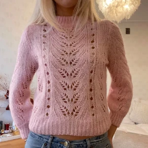 Säljer en söt rosa stickad tröja med ett vackert hålmönster framtill. Tröjan har långa ärmar och en ribbad kant vid ärmslut och nederkant. Perfekt för en mysig dag!