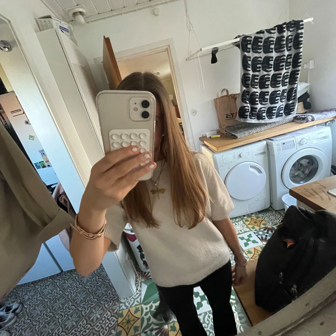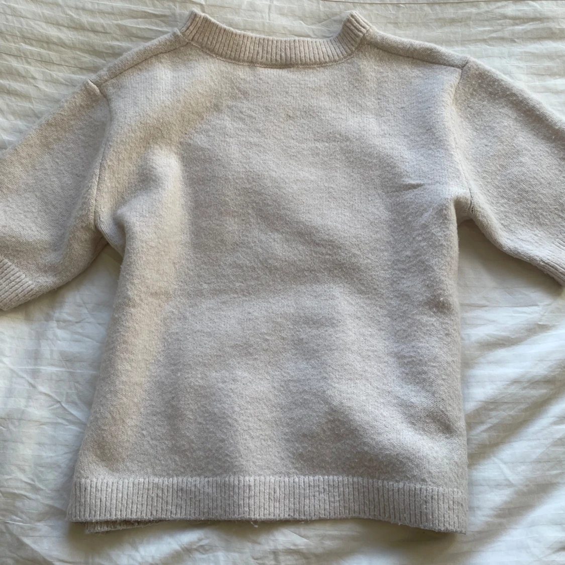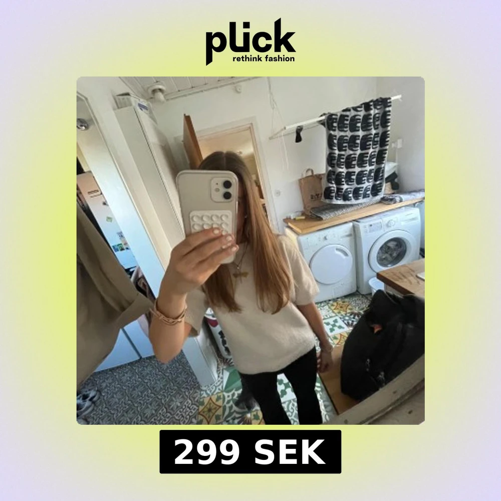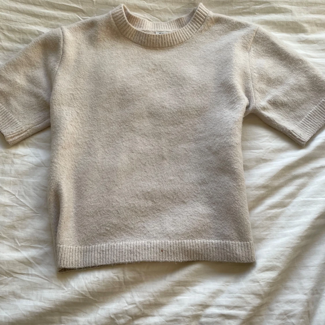Säljer en stilren beige stickad tröja med korta ärmar. Perfekt för en avslappnad look. Tröjan har ribbade kanter vid hals, ärmslut och nederkant.