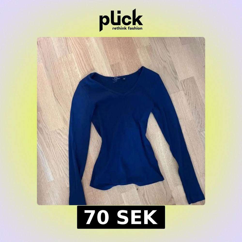 Säljer en marinblå långärmad topp i ribbat material med v-ringad hals. Sitter tight och har en enkel, stilren look som passar perfekt till jeans eller kjol. Superskön och stretchig modell för dig som gillar basic men ändå vill ha något snyggt.