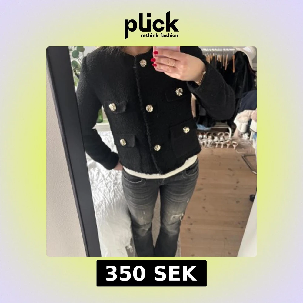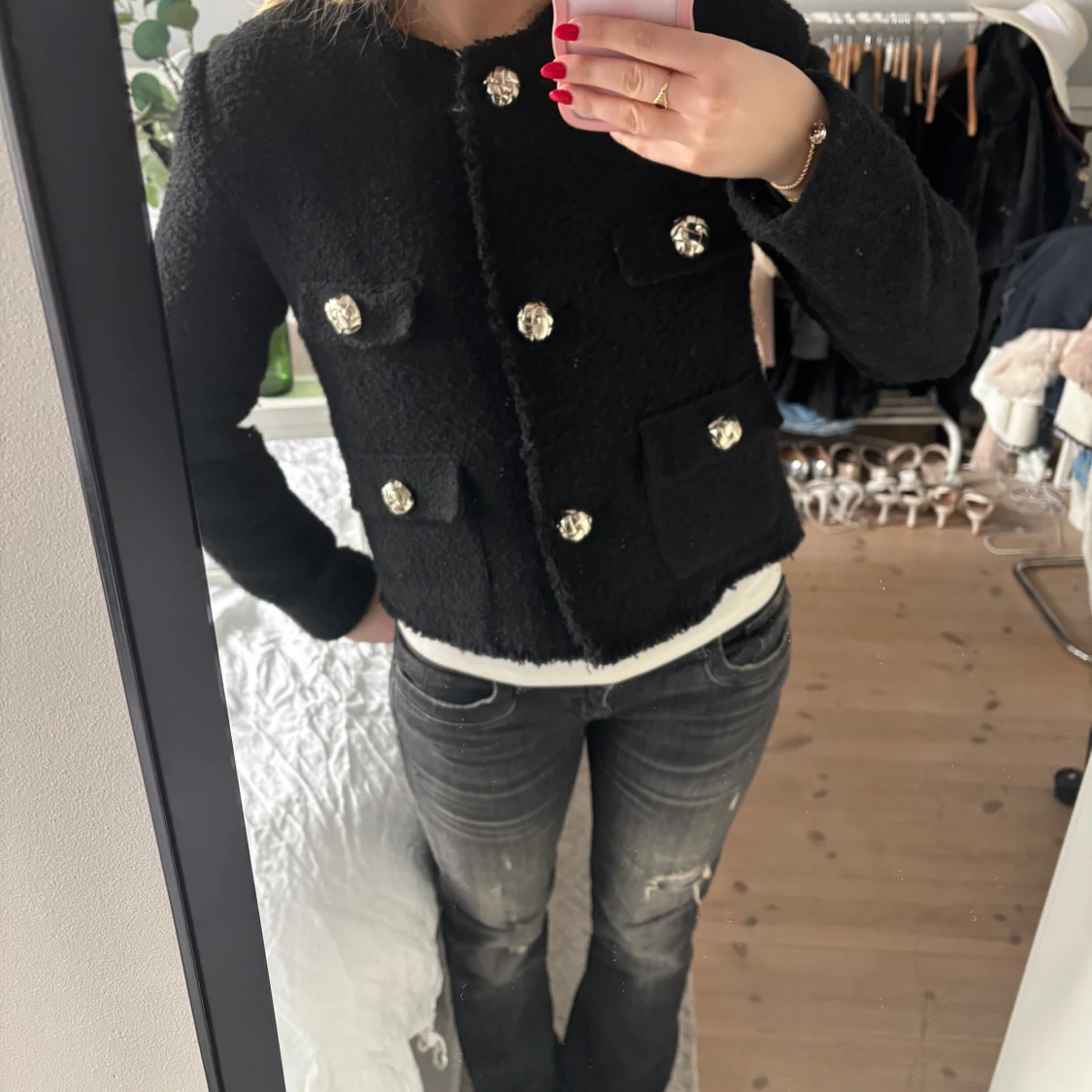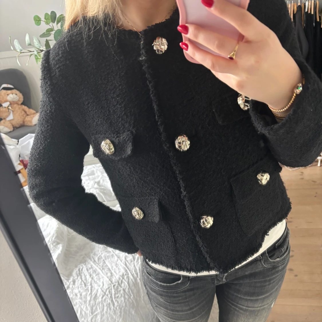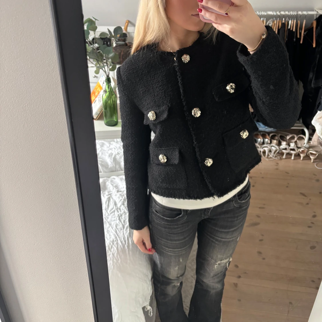 Superfin kavaj som funkar fint som kofta i tweed med guldiga knappar.