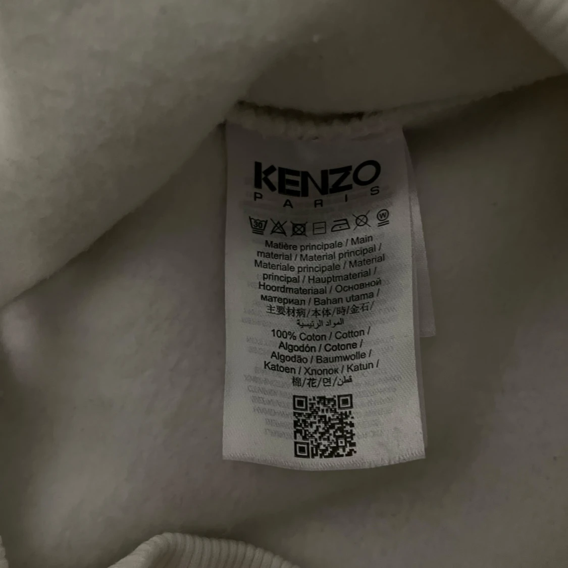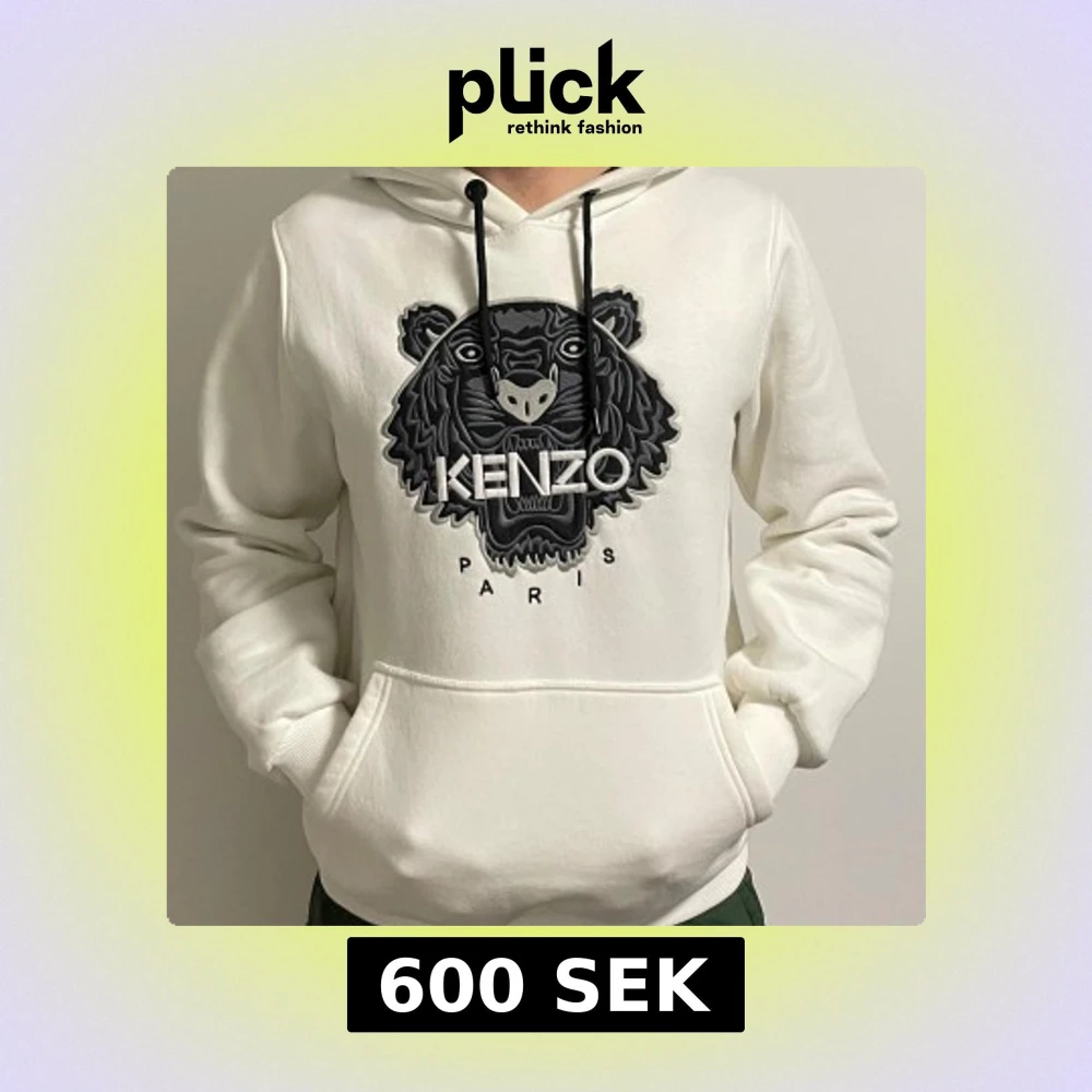 Säljer en vit hoodie från Kenzo med stort svart tigertryck och logga på bröstet. Tröjan har huva med svarta snören och en stor magficka. Tillverkad i mjuk bomull. OBS! Tröjan är i storlek XL men har passform för M.