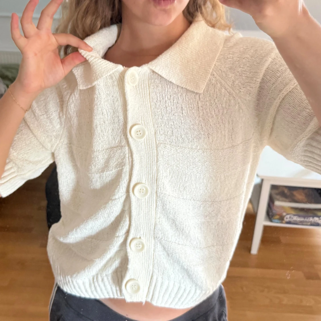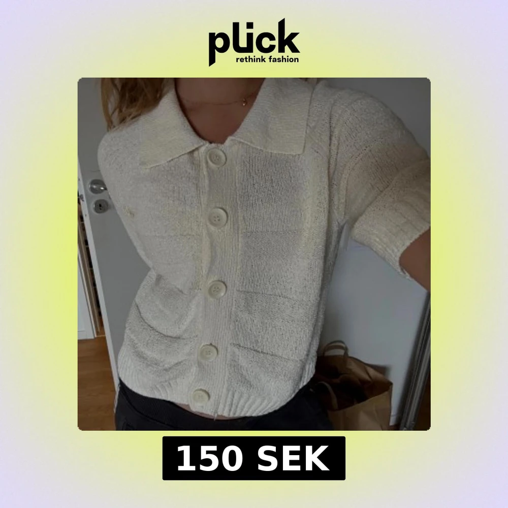 Säljer en vit stickad kofta med korta ärmar och stora, snygga knappar framtill. Koftan har en bred krage och ribbade muddar nedtill. Perfekt för dig som gillar en chill och stilren look till våren eller sommaren. Köpt på lindex för 499kr 🤍
