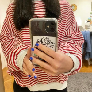 Röd och vit randig sweatshirt. Köppt secondhand och lappen är borta så oklart var den är ifrån och vilken storlek men ungefär S/M. Bra skick.